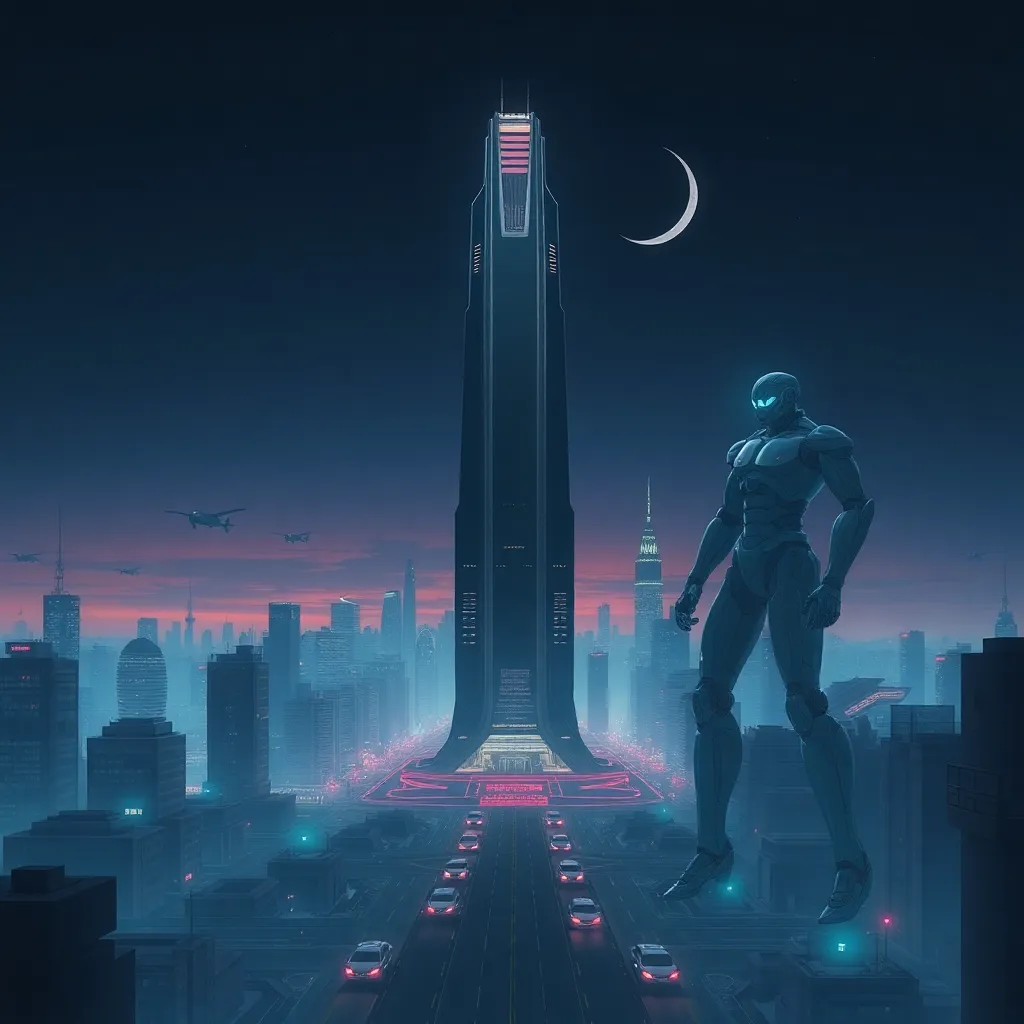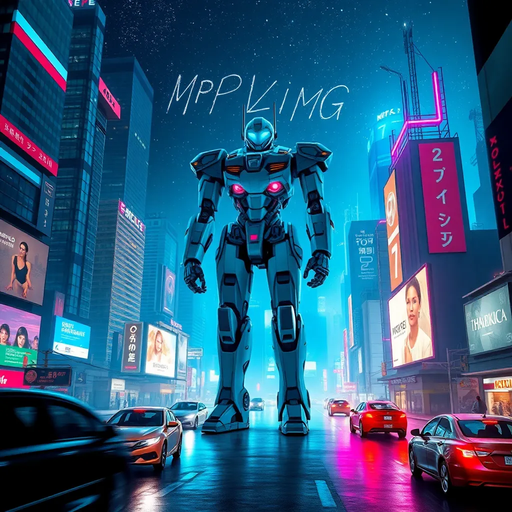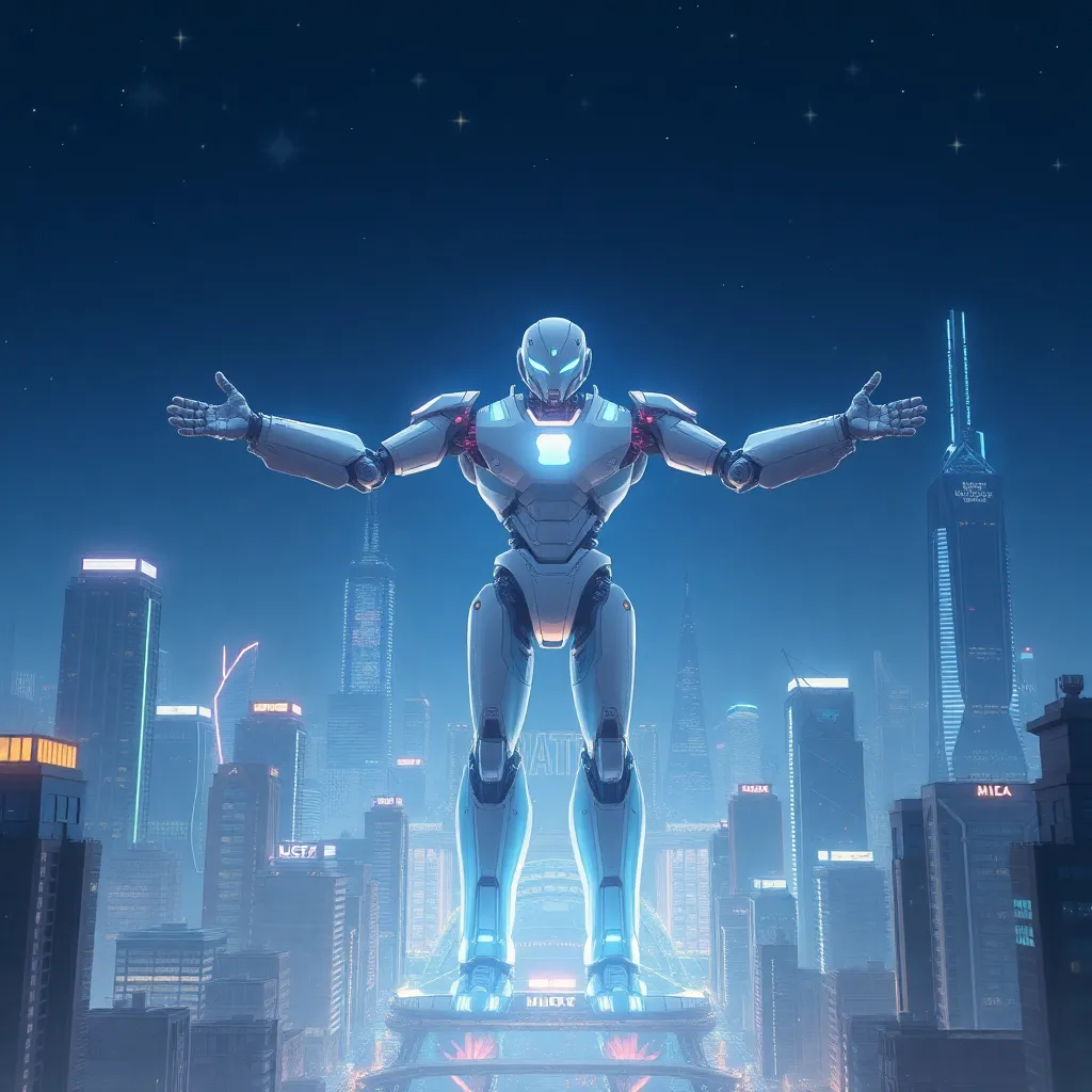 Imagine a futuristic cityscape with towering skyscrapers and neon lights. In the center, a massive robot stands tall, its body glowing with a soft blue light. The robot's arms are outstretched, as if embracing the city. The sky is a deep shade of indigo, with stars twinkling like diamonds. Generate an AI image that captures this scene.