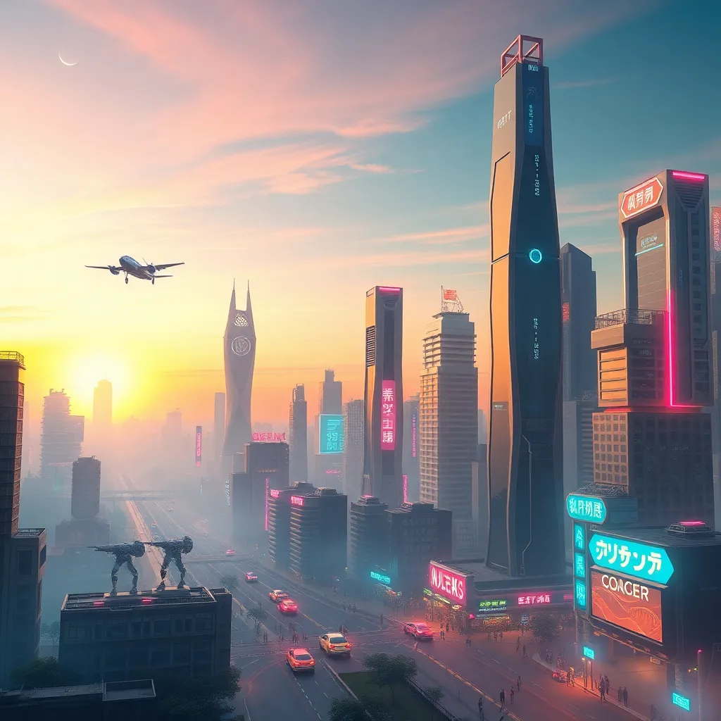 Imagine a futuristic cityscape at dusk, with sleek skyscrapers and flying cars zipping by. The sky is painted with hues of pink and orange, and a giant robot stands tall in the center, its glowing blue eyes watching over the bustling metropolis. Generate an AI image that captures this futuristic scene.