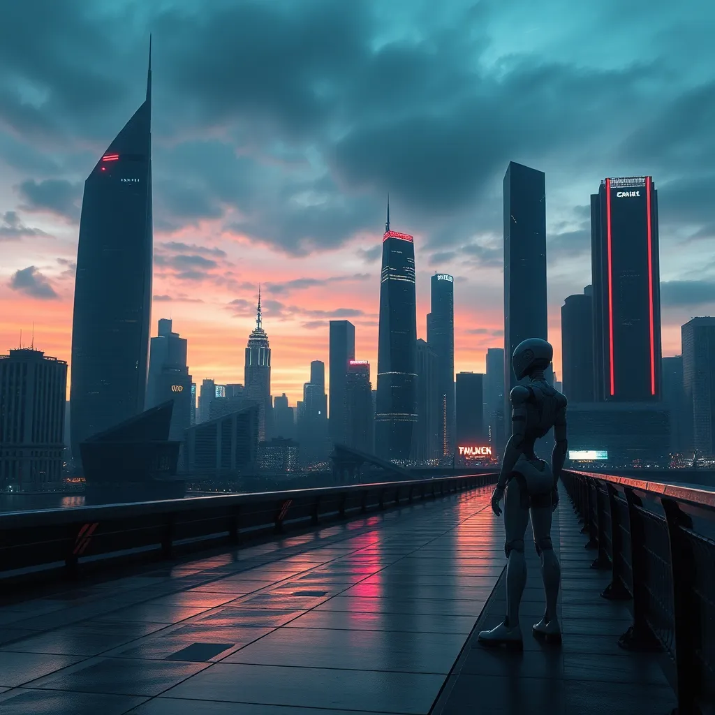 Create an futuristic cityscape at dusk, with sleek skyscrapers and neon lights reflecting off the wet pavement. Incorporate a humanoid robot standing at the edge of the city, looking out at the horizon with a sense of longing. The atmosphere should be moody and introspective, with a hint of nostalgia.