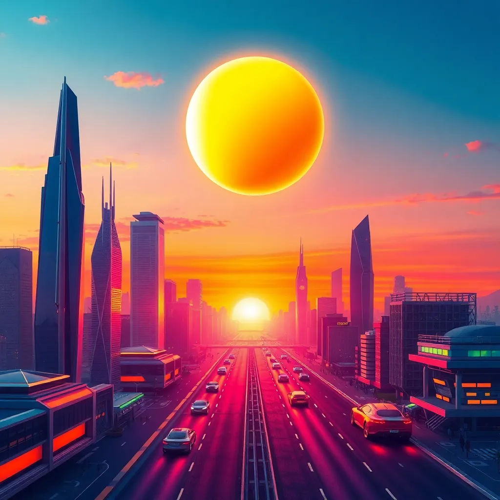 Create a futuristic cityscape at sunset, with sleek skyscrapers and hovering cars. Incorporate a large, glowing orb hovering above the city, emitting a warm, golden light. The atmosphere should be vibrant and energetic, with a sense of innovation and progress. Use bold, bright colors and dynamic shapes.