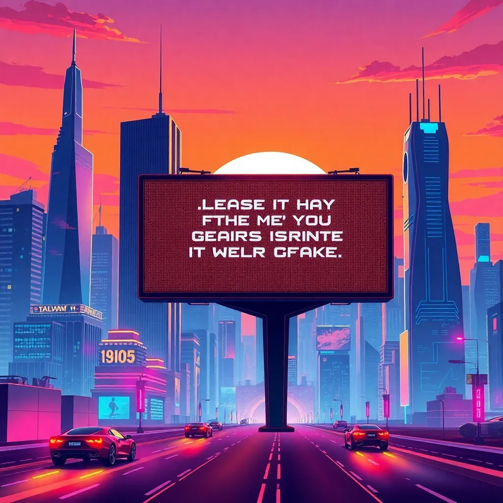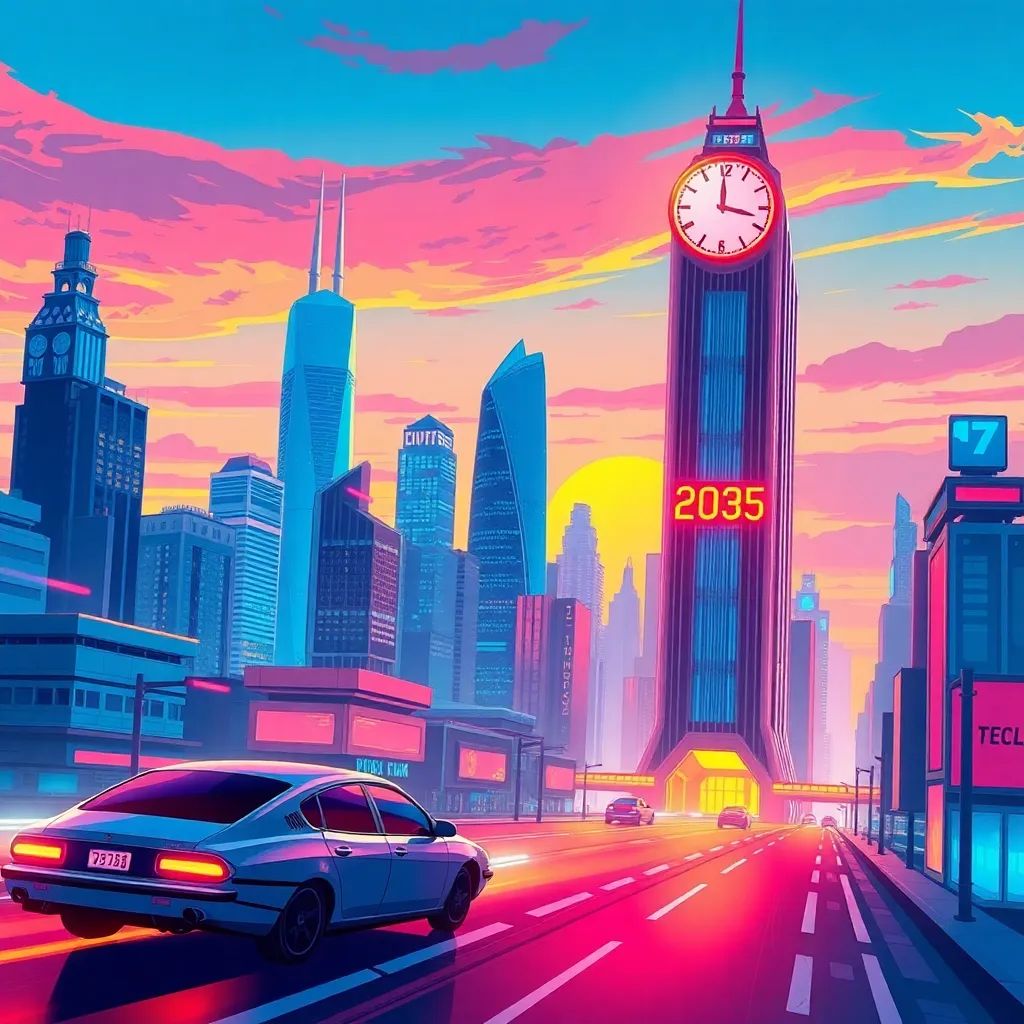 Create an illustration of a futuristic cityscape at sunset, with towering skyscrapers and flying cars zipping by. Incorporate vibrant colors and neon lights, and include a prominent clock tower with a glowing digital display reading '2035'. The image should evoke a sense of excitement and possibility.