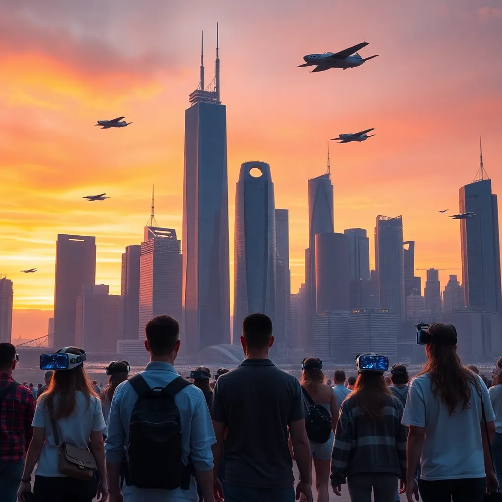 Imagine a futuristic cityscape at sunset, with towering skyscrapers and flying cars zipping by. The sky is painted with hues of orange, pink, and purple. In the foreground, a group of people in VR headsets are walking towards the city, lost in their virtual worlds. Generate an image that captures this scene.