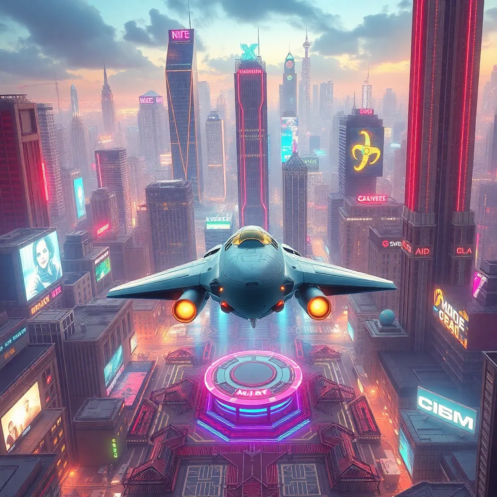 Imagine a futuristic cityscape with towering skyscrapers, neon lights, and a sprawling metropolis. Incorporate a sleek, high-tech spacecraft landing on the city's main square, surrounded by holographic advertisements and flying drones. Generate an image that captures the vibrant energy and fusion of technology and urban life.