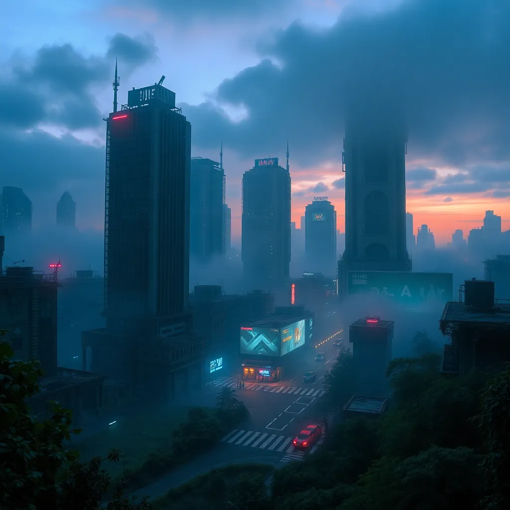 Create an eerie and abandoned futuristic cityscape at dusk, with crumbling skyscrapers, overgrown streets, and a haunting fog rolling in. Incorporate neon lights and holographic advertisements flickering to life, hinting at the city's former glory. Use a mix of blues and purples to evoke a sense of mystery and decay.