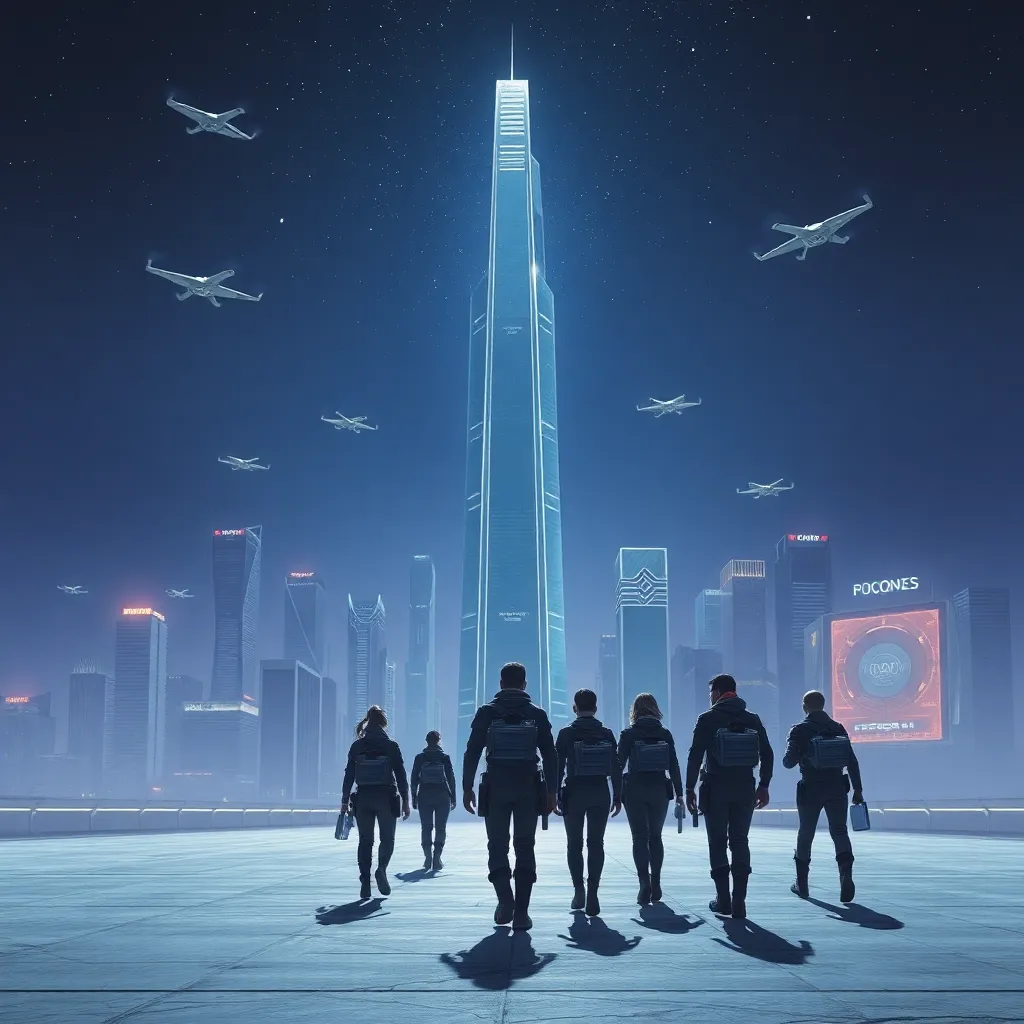 Imagine a futuristic cityscape with a gleaming skyscraper in the center, surrounded by sleek flying cars and hovering drones. The sky is a deep shade of indigo, with stars twinkling like diamonds. In the foreground, a group of people in futuristic attire walk towards the city, carrying strange devices