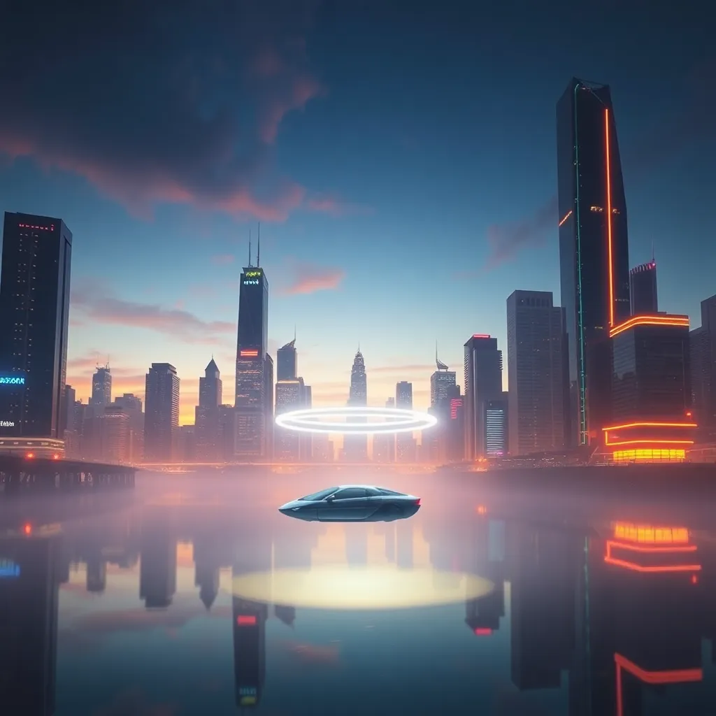 Imagine a futuristic cityscape at dusk, with towering skyscrapers and neon lights reflecting off a calm lake. A sleek, silver hovercraft soars above, leaving a trail of sparkling water droplets. Incorporate subtle AI-generated textures and vibrant colors to create a captivating visual representation of innovation and technological advancement.
