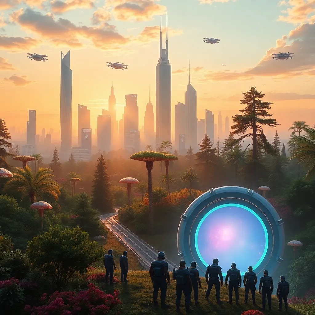 Imagine a futuristic cityscape at sunset, with sleek skyscrapers and hovering cars. The city is surrounded by a lush, vibrant forest, with towering trees and glowing mushrooms. In the foreground, a group of humans and robots are gathered around a massive, glowing portal. Generate an AI image that captures this scene.