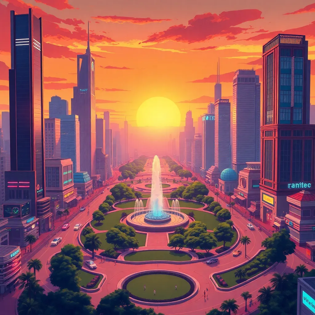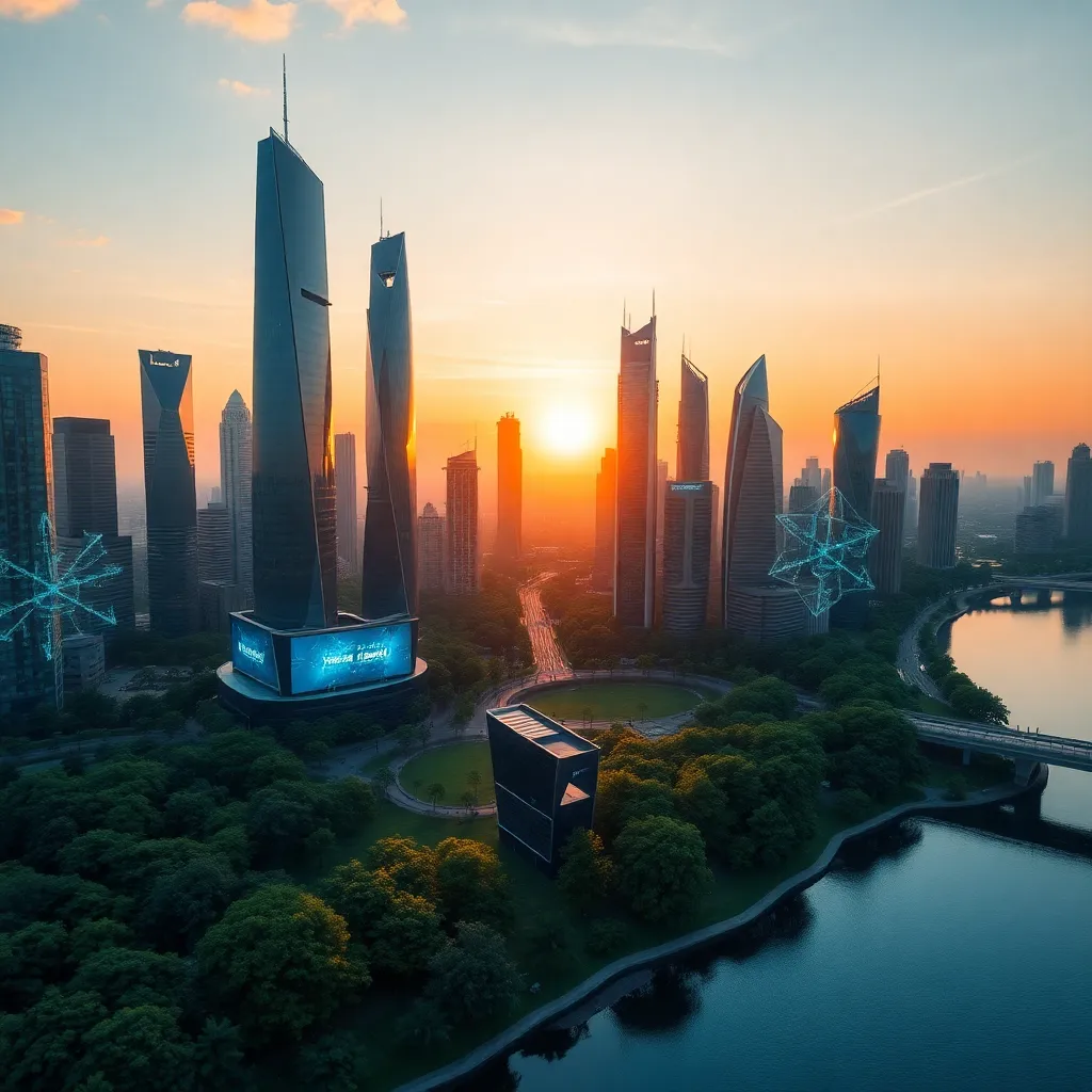 Create a futuristic cityscape at sunset, with towering skyscrapers and sleek architecture, surrounded by a lush green park and a serene lake. Incorporate AI-generated elements, such as holographic advertisements and self-driving cars, to showcase the blend of technology and nature in a futuristic metropolis.