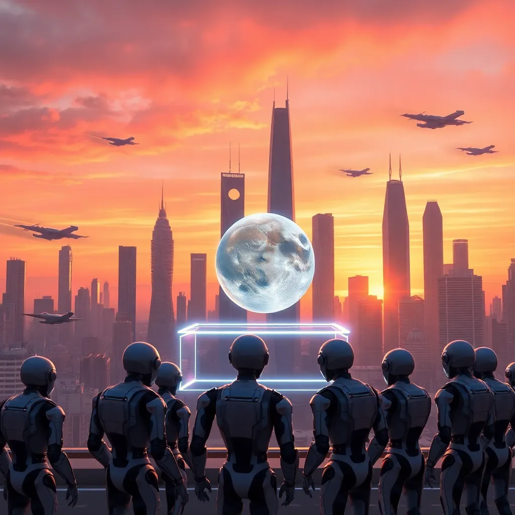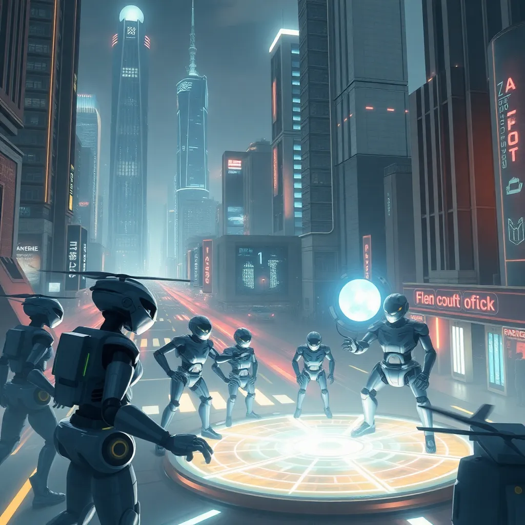 Imagine a futuristic cityscape with towering skyscrapers and sleek, neon-lit streets. A group of robots and drones are gathered around a glowing, holographic display. One robot is holding a small, glowing orb that is emitting a soft blue light. The atmosphere is futuristic and high-tech, with a hint of mystery.