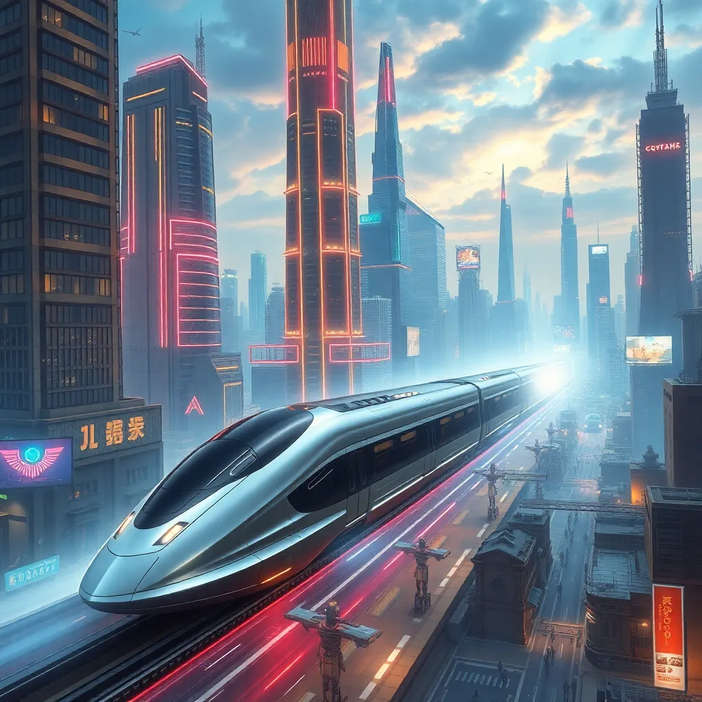 Create a futuristic cityscape with towering skyscrapers, neon lights, and a sprawling metropolis. Incorporate a sleek, silver bullet train zooming through the city, with a hint of steam rising from its engine. Add a touch of sci-fi elements, such as holographic advertisements and robots roaming the streets.