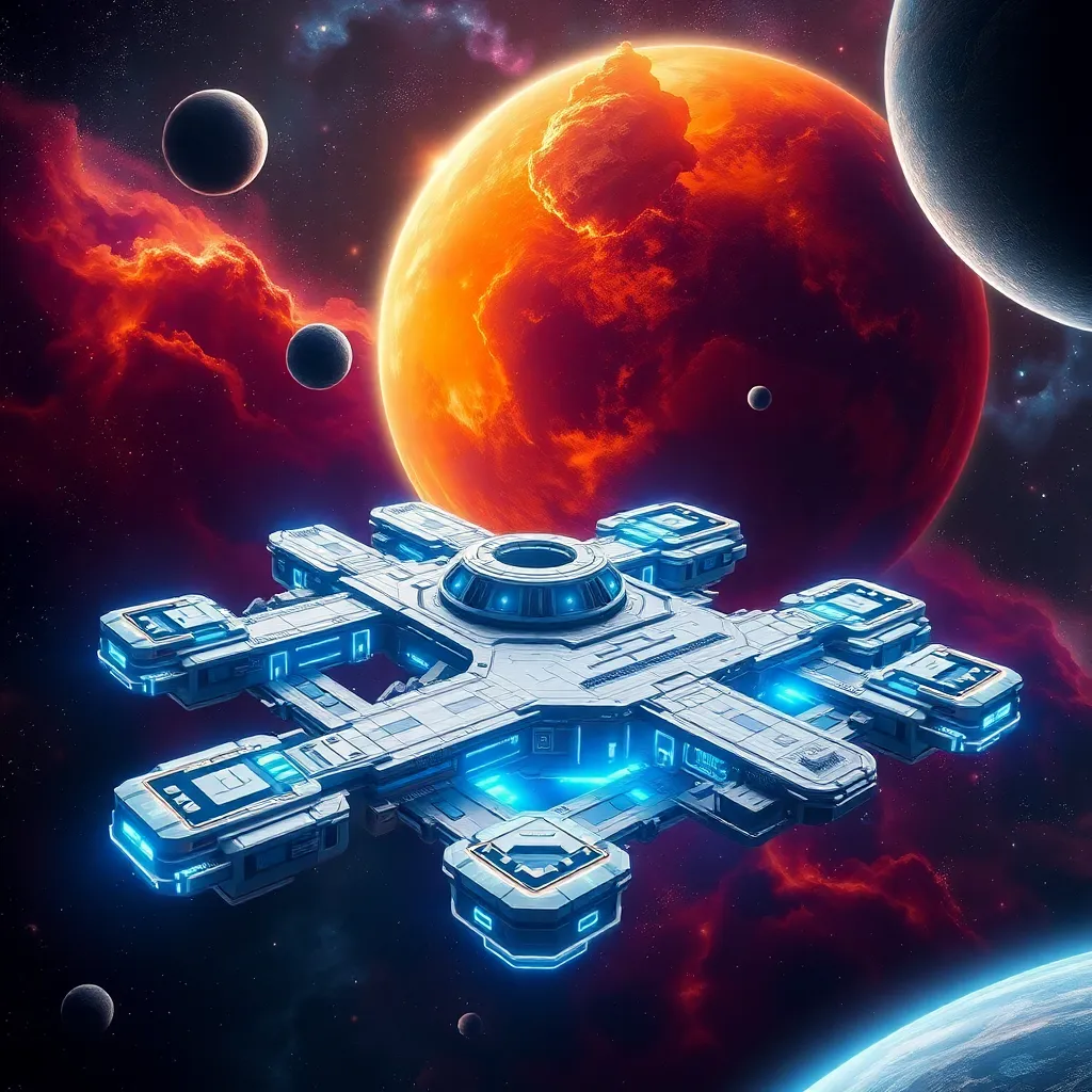 "Create an futuristic space station floating in the midst of a vibrant nebula, with glowing blue corridors, sleek silver modules, and a sprawling command center. Incorporate a range of stars, planets, and asteroids in the background, with a sense of depth and dimensionality. Make the station look like a thriving hub of intergalactic activity.