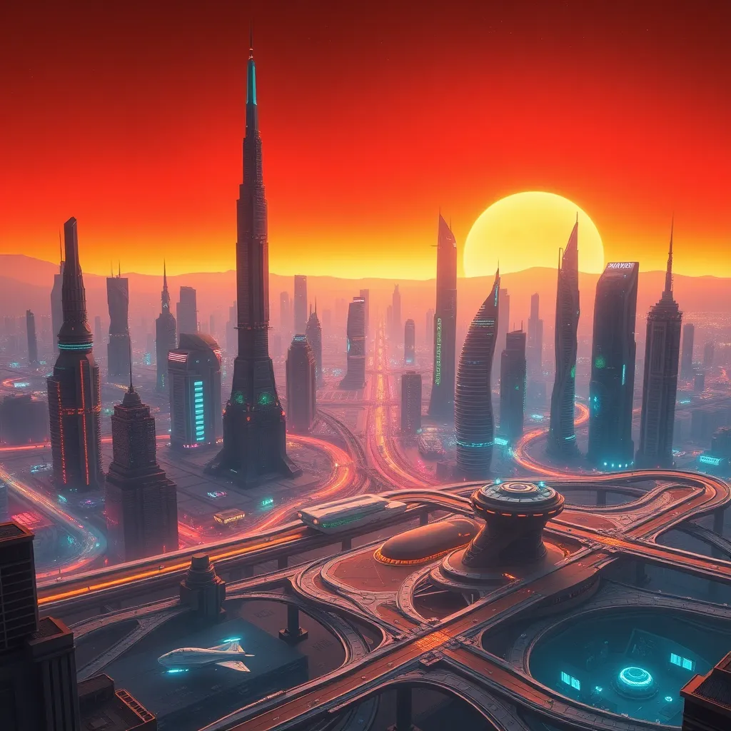 Create a futuristic cityscape with towering skyscrapers, flying cars, and neon lights. The city should be set on a distant planet with a red-orange sky. Incorporate a sprawling metropolis with a central hub, a spaceport, and a network of elevated walkways. The scene should exude a sense of innovation and progress.