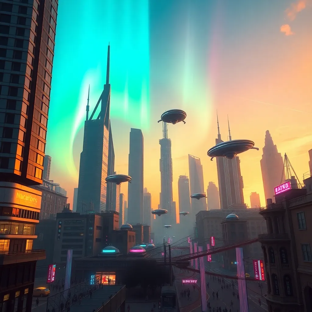 Create an ethereal futuristic cityscape at sunset, with towering skyscrapers and holographic advertisements reflecting off the calm waters of a nearby lake. Incorporate a subtle aurora borealis effect in the sky and a sense of mystique and wonder. Generate an image that captures the essence of a utopian metropolis.