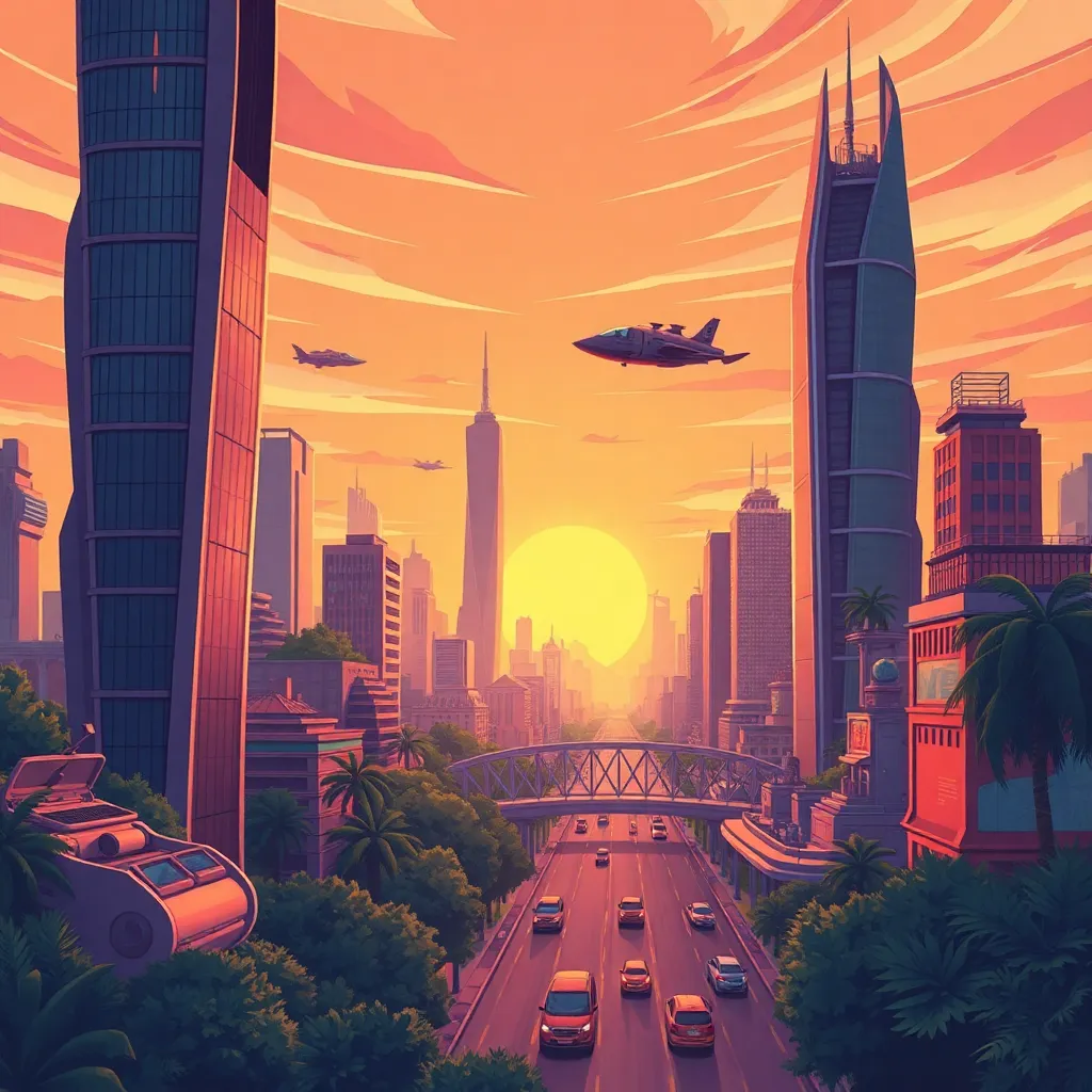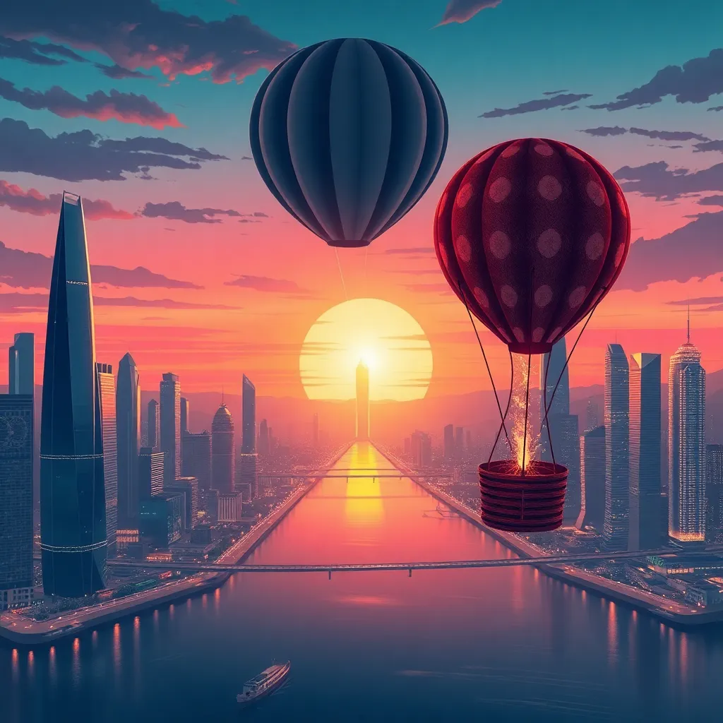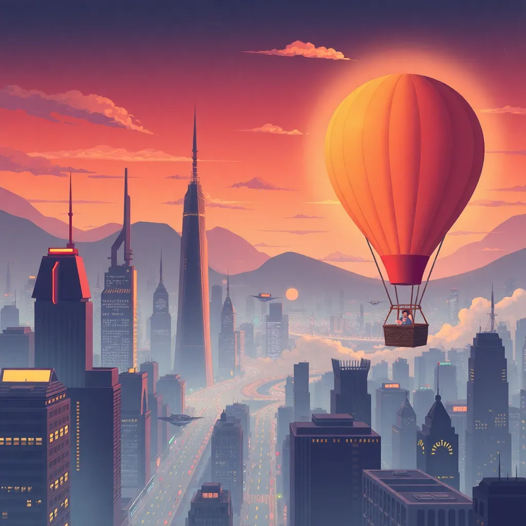 Create an illustration of a whimsical, futuristic cityscape at sunset, with towering skyscrapers and neon-lit streets. Incorporate a vintage-style hot air balloon soaring above the city, surrounded by a halo of light and wispy clouds. Blend futuristic and nostalgic elements to evoke a sense of wonder and curiosity.