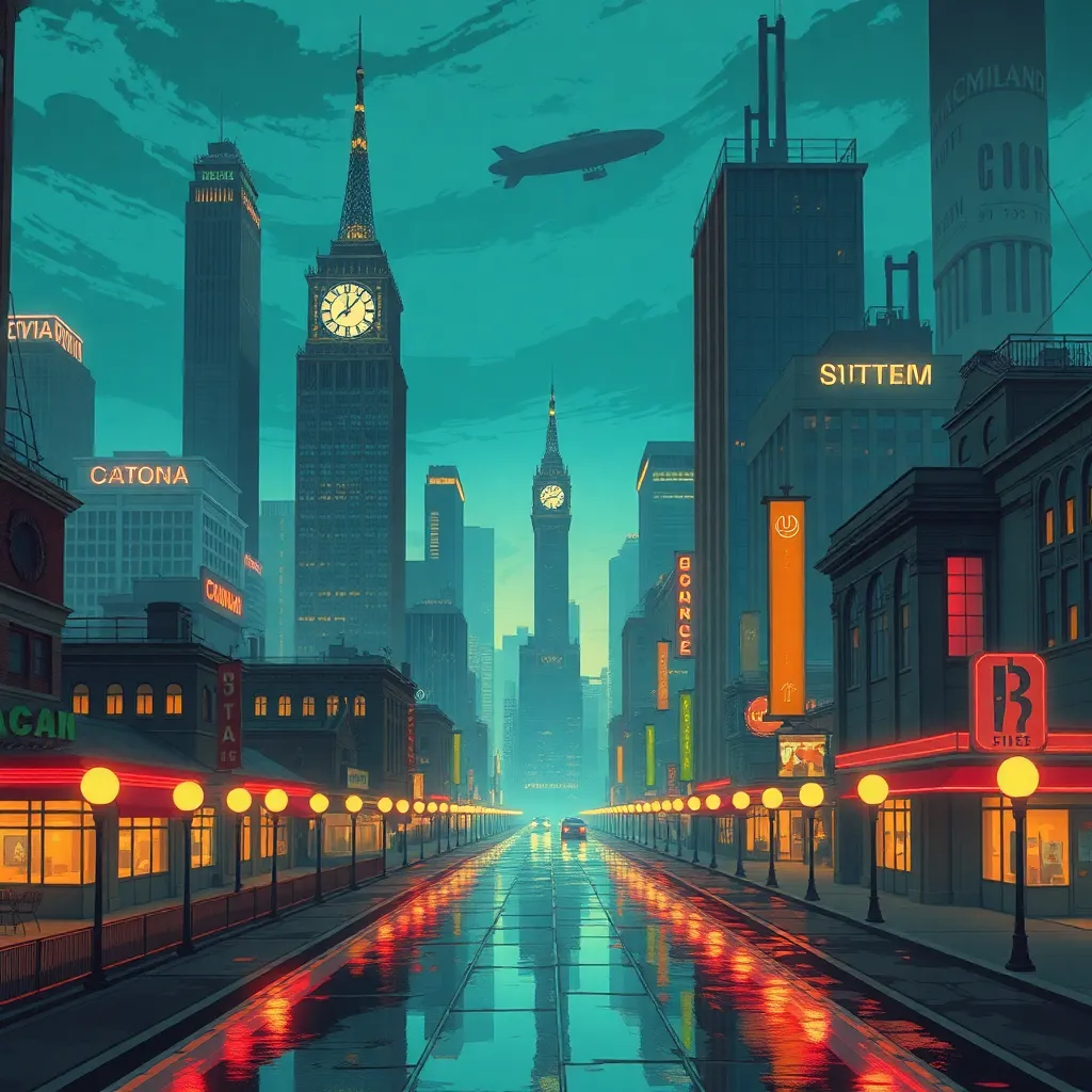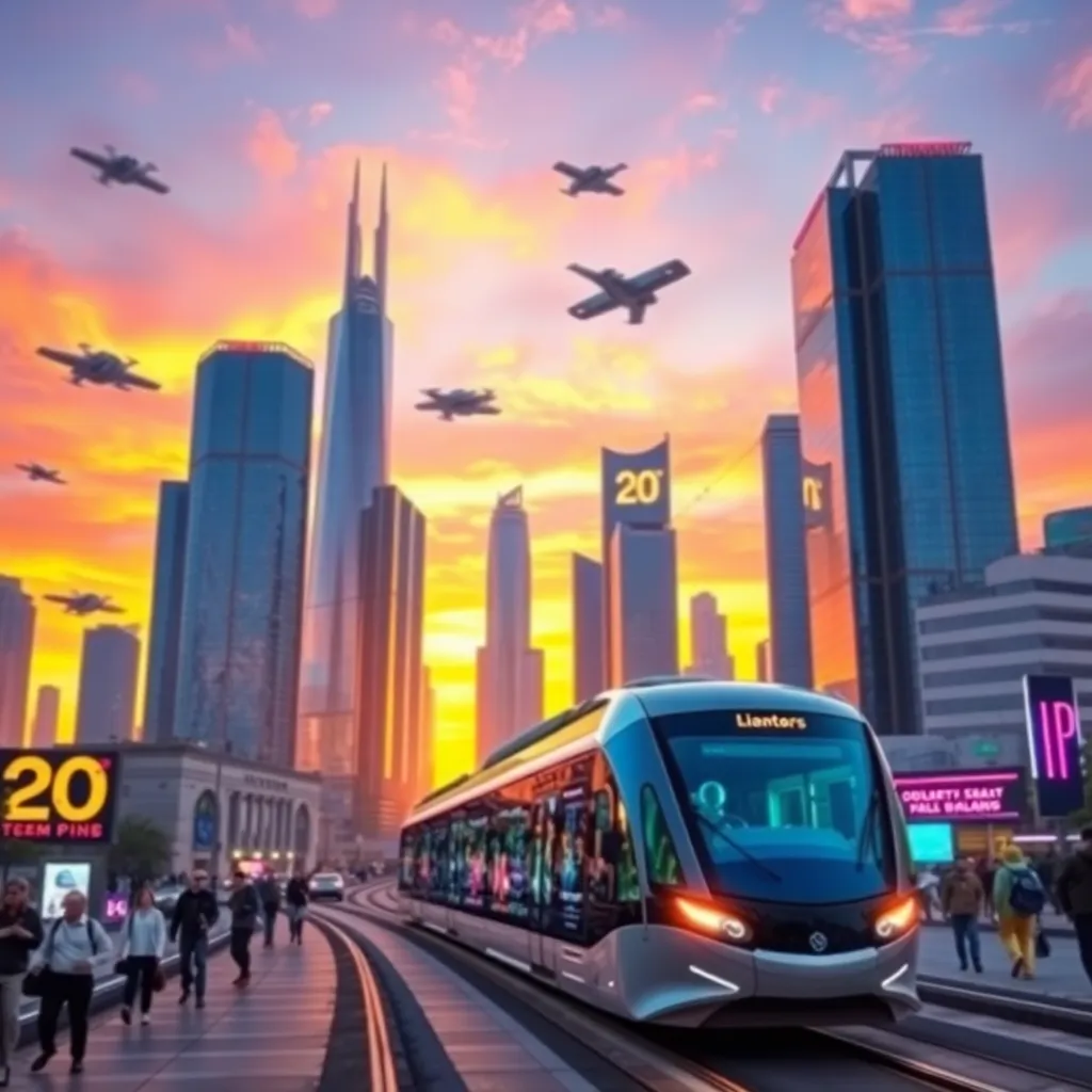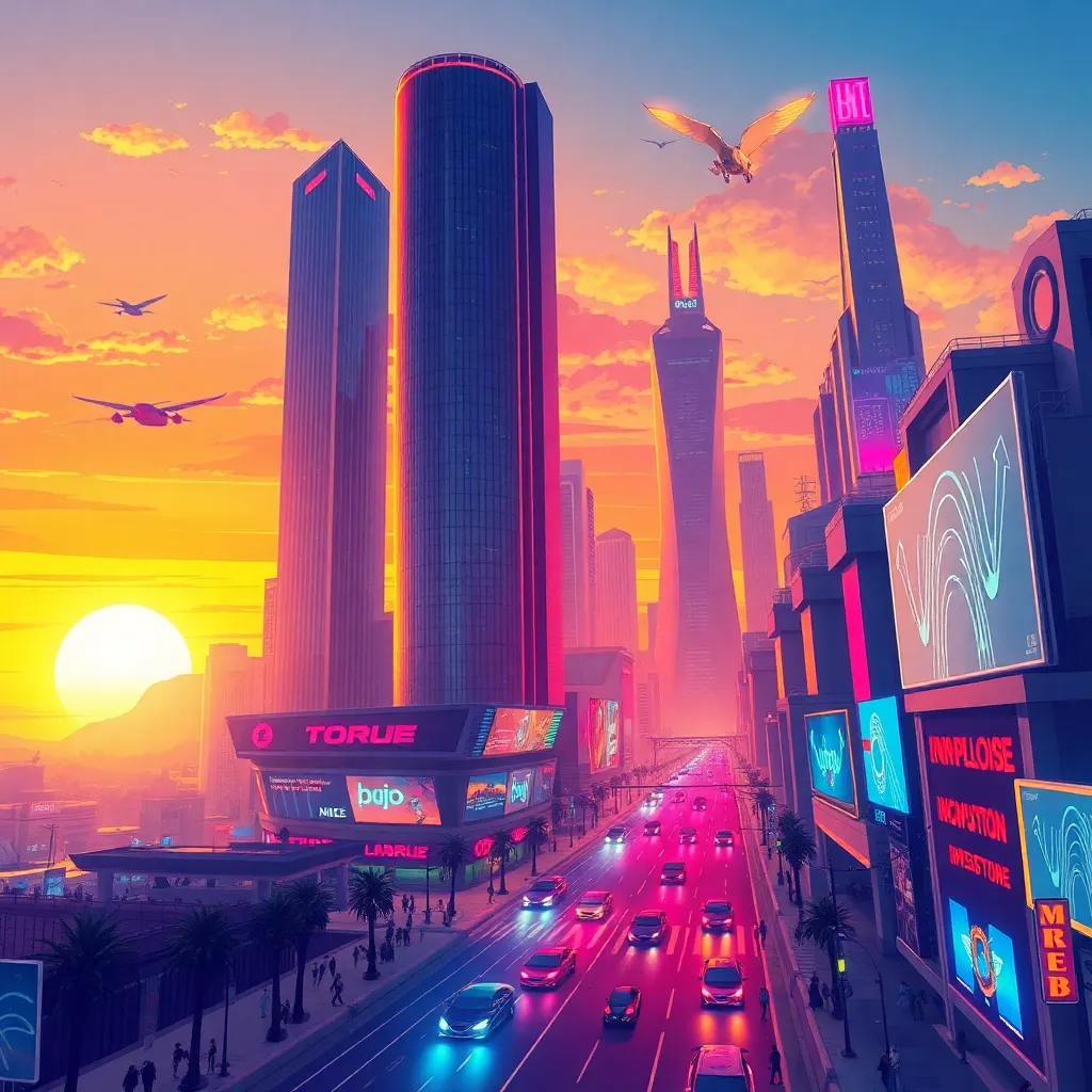 Create an illustration of a whimsical, futuristic cityscape at sunset, with towering skyscrapers and neon-lit streets. Incorporate a vintage-style hot air balloon soaring above the city, surrounded by a halo of light and wispy clouds. Blend futuristic and nostalgic elements to evoke a sense of wonder and curiosity.