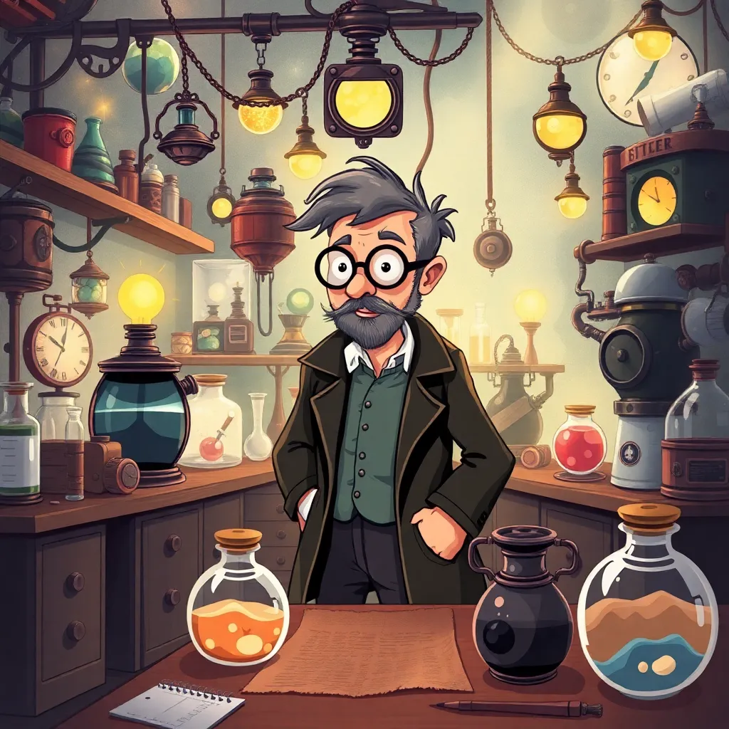 Create an illustration of a whimsical, steampunk-inspired laboratory filled with curious contraptions, twinkling lights, and mysterious artifacts. Incorporate a bespectacled scientist in the center, surrounded by intricate machinery and peculiar experiments, with a sense of wonder and discovery emanating from the scene.