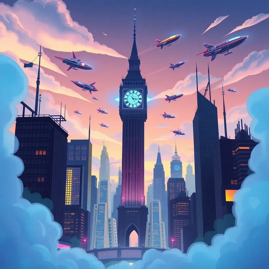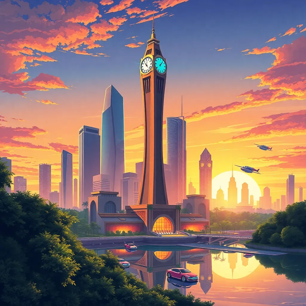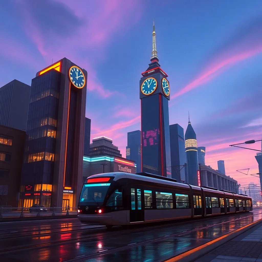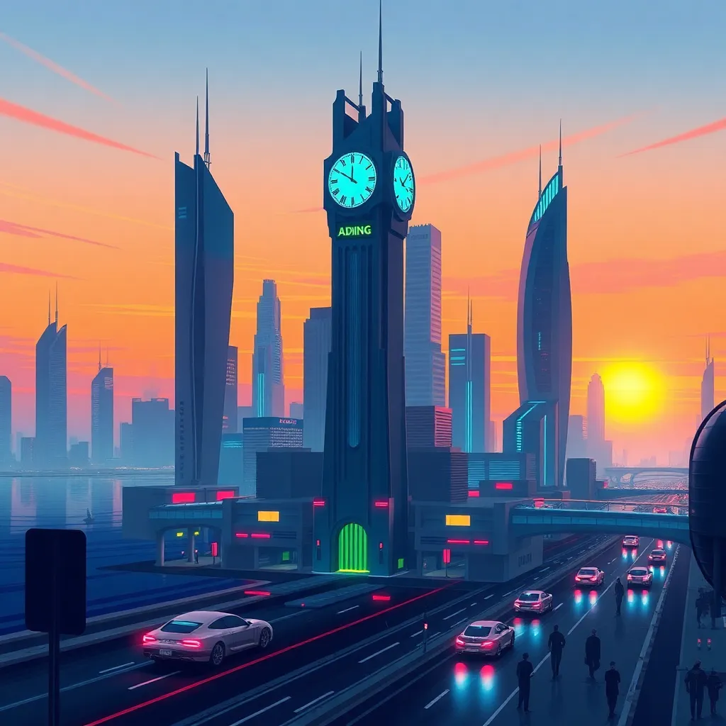 Create an illustration of a futuristic cityscape at sunset, with sleek skyscrapers and neon lights reflecting off the water. Incorporate a prominent clock tower with a glowing blue face, surrounded by a bustling streetscape with flying cars and pedestrians in futuristic attire. Add a vibrant orange and pink sky.