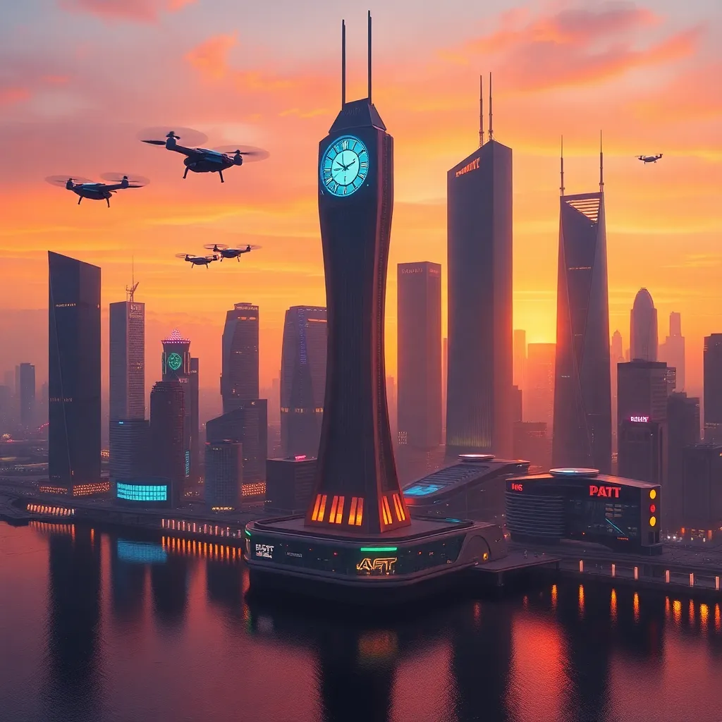 Create an image of a futuristic cityscape at sunset, with sleek skyscrapers and neon lights reflecting off the water. Incorporate a prominent clock tower with a glowing blue face, surrounded by flying drones and hovercars. The atmosphere should be vibrant and energetic, with a hint of mystery and adventure.
