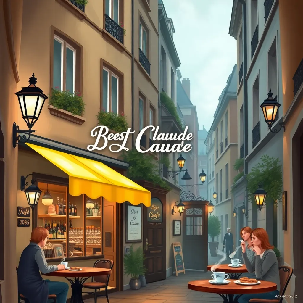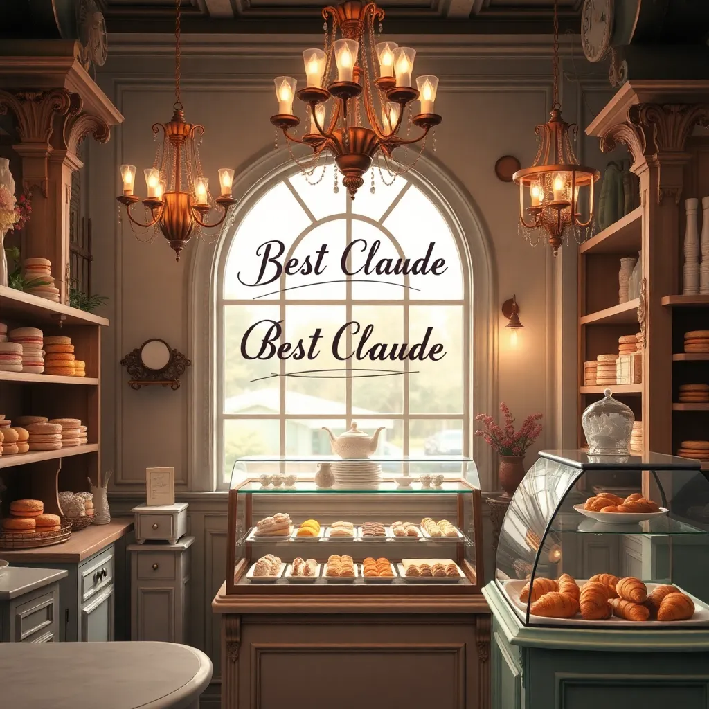 Create an image of a whimsical, vintage-inspired French patisserie, 'Best Claude', with ornate wooden fixtures, twinkling chandeliers, and a display case filled with delicate macarons, croissants, and other sweet treats. Incorporate soft pastel colors, distressed textures, and a touch of nostalgia to evoke a sense of warmth and indulgence.