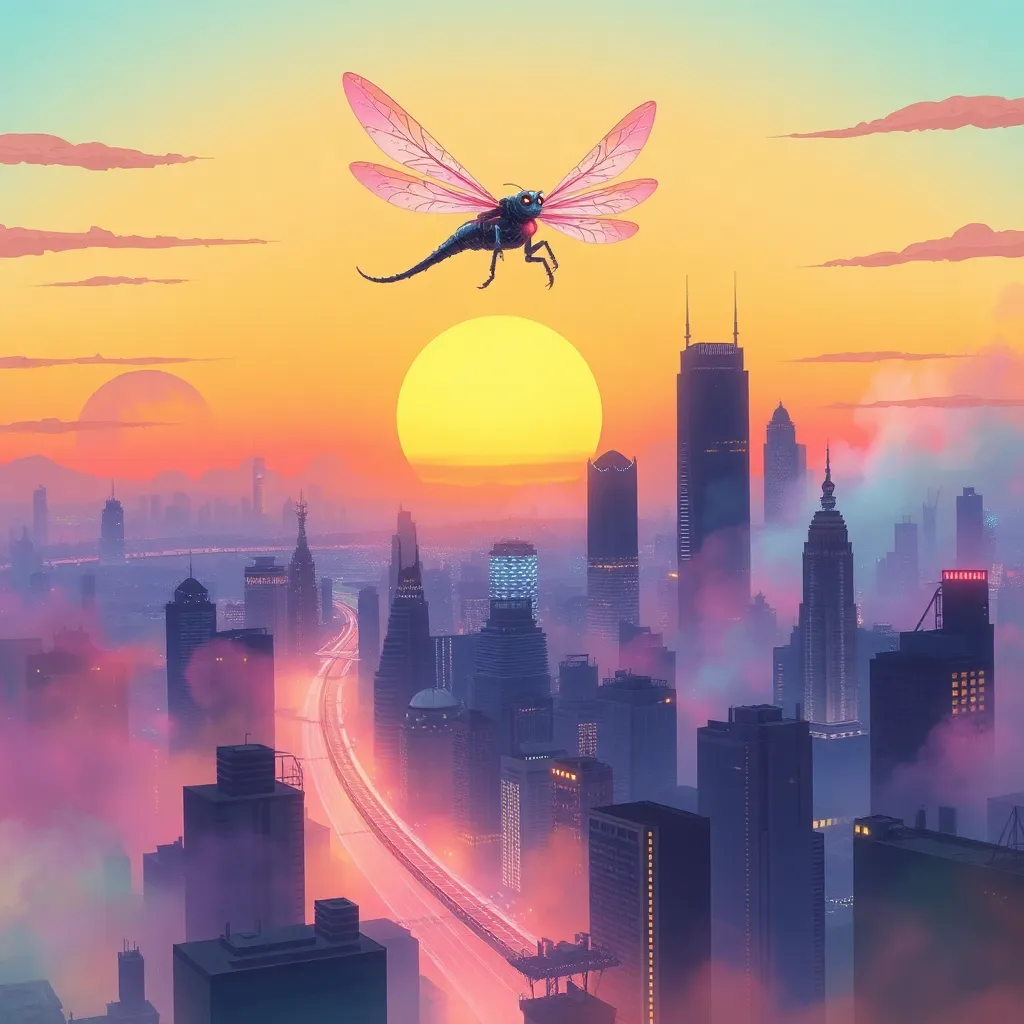 Create an illustration of a whimsical, futuristic cityscape at sunset. Incorporate a majestic, glowing dragonfly-like robot hovering above the skyline, surrounded by neon-lit skyscrapers and a vibrant, swirling mist of colors. The atmosphere should be dreamy and enchanting, with a hint of steampunk flair.
