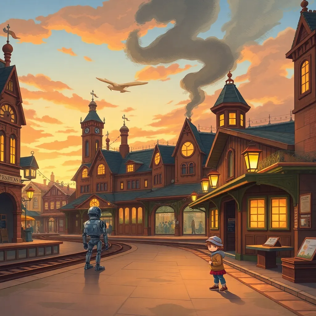 Create an illustration of a whimsical, steampunk-inspired train station at sunset. The station should be designed with intricate clockwork machinery and vintage lamps. Surrounding buildings should be a mix of old and new, with a hint of magic in the air. Include a few characters, such as a clockwork robot and a curious child, exploring the station.