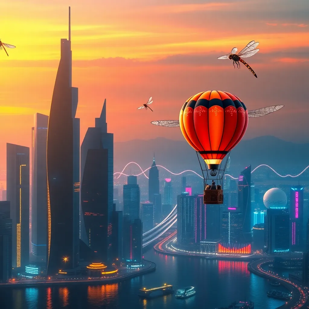 Create a futuristic cityscape at sunset, with sleek skyscrapers and neon lights reflecting off the water. Incorporate a vintage-style hot air balloon soaring above the city, with a majestic dragonfly hovering nearby. The atmosphere should be vibrant and electric, with a sense of excitement and adventure.