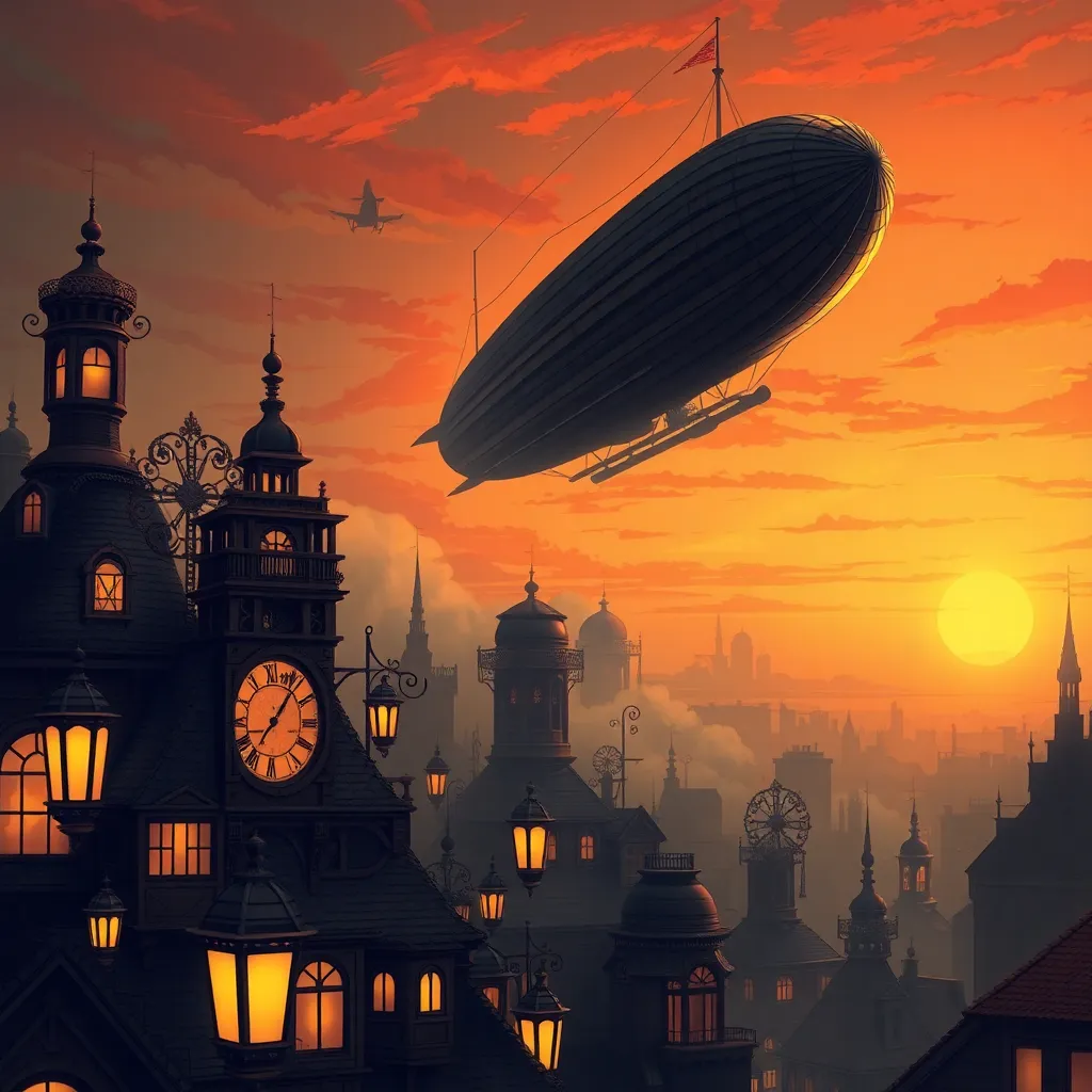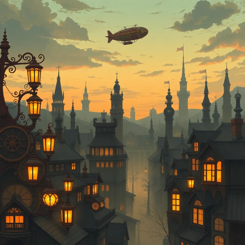 Create an illustration of a whimsical, steampunk-inspired cityscape at dusk. Incorporate intricate clockwork machinery, glowing lanterns, and a majestic airship soaring above the rooftops. The atmosphere should be mystical, with a hint of nostalgia and wonder. Use a muted color palette with pops of warm, golden light.