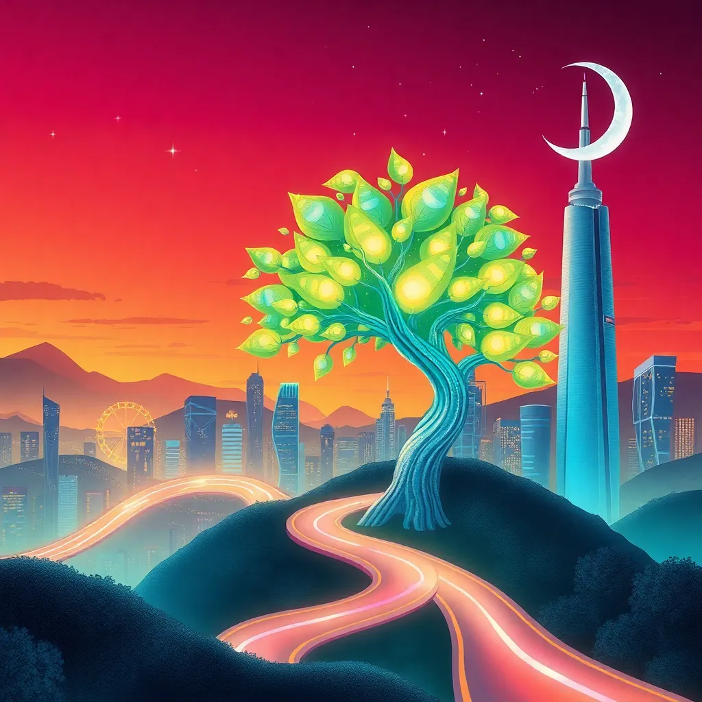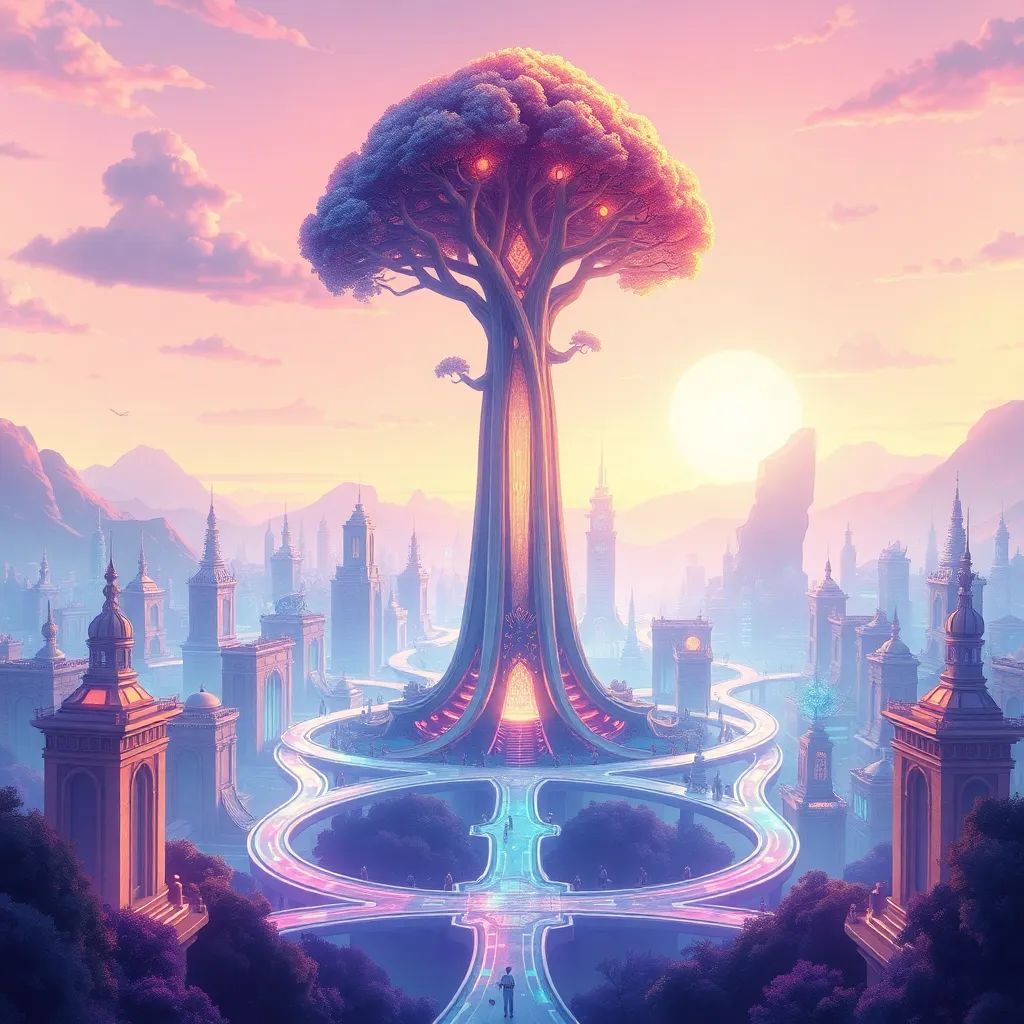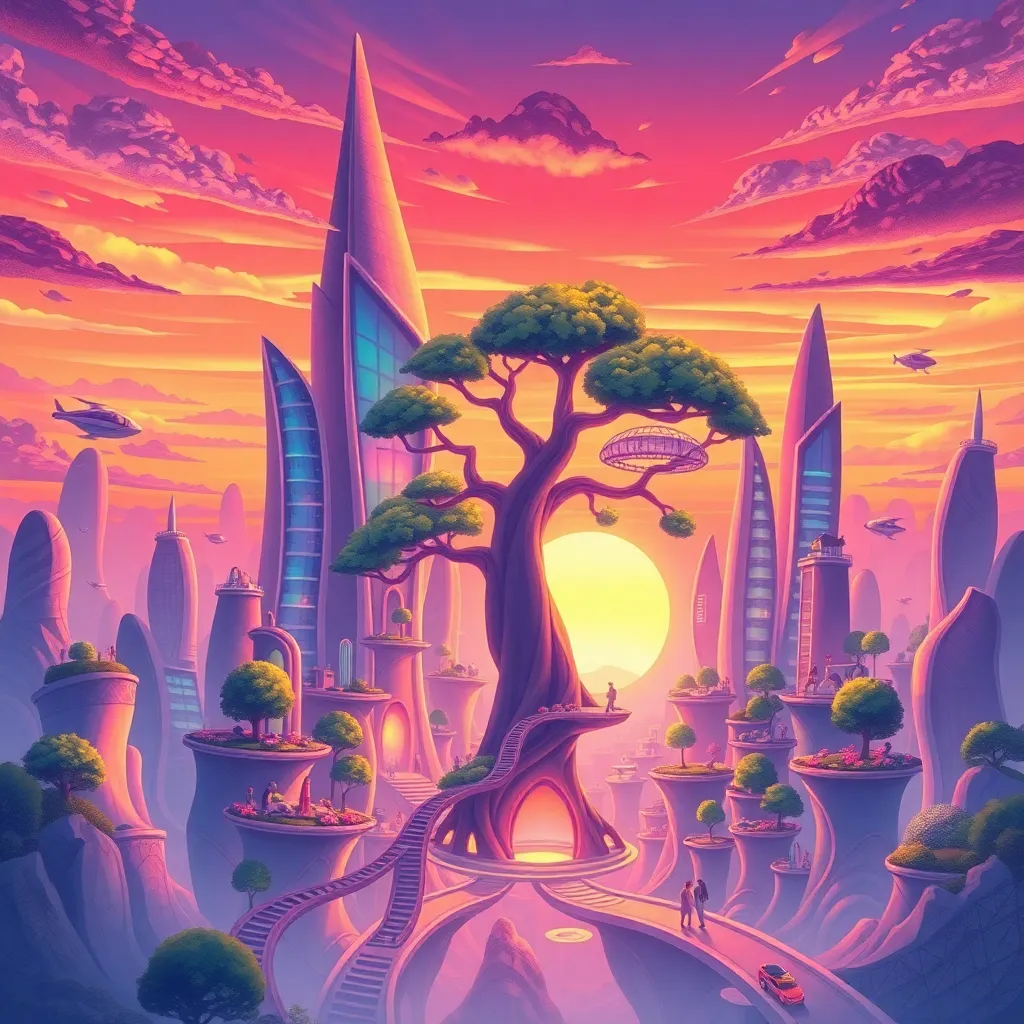 Create an illustration of a whimsical, futuristic cityscape at sunset. Incorporate towering skyscrapers with curved, iridescent surfaces, surrounded by floating gardens and levitating vehicles. Include a majestic, glowing tree at the city's center, with a subtle, shimmering aura. Use vibrant colors and soft, dreamy lighting.
