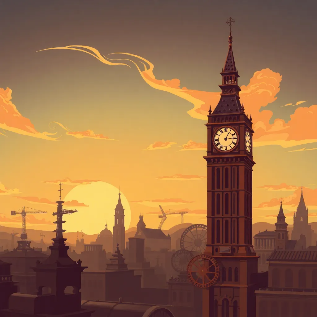 Create an illustration of a vintage-inspired, steampunk-inspired cityscape at sunset, featuring a majestic clock tower, intricate gears, and wispy clouds. Incorporate a sense of nostalgia and adventure, with a warm color palette and subtle textures. The scene should evoke a sense of wonder and curiosity.