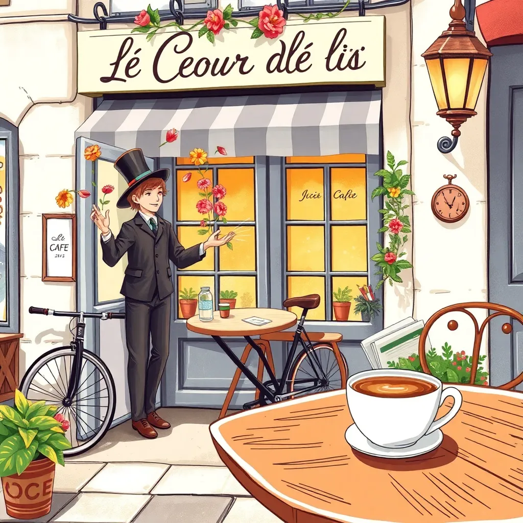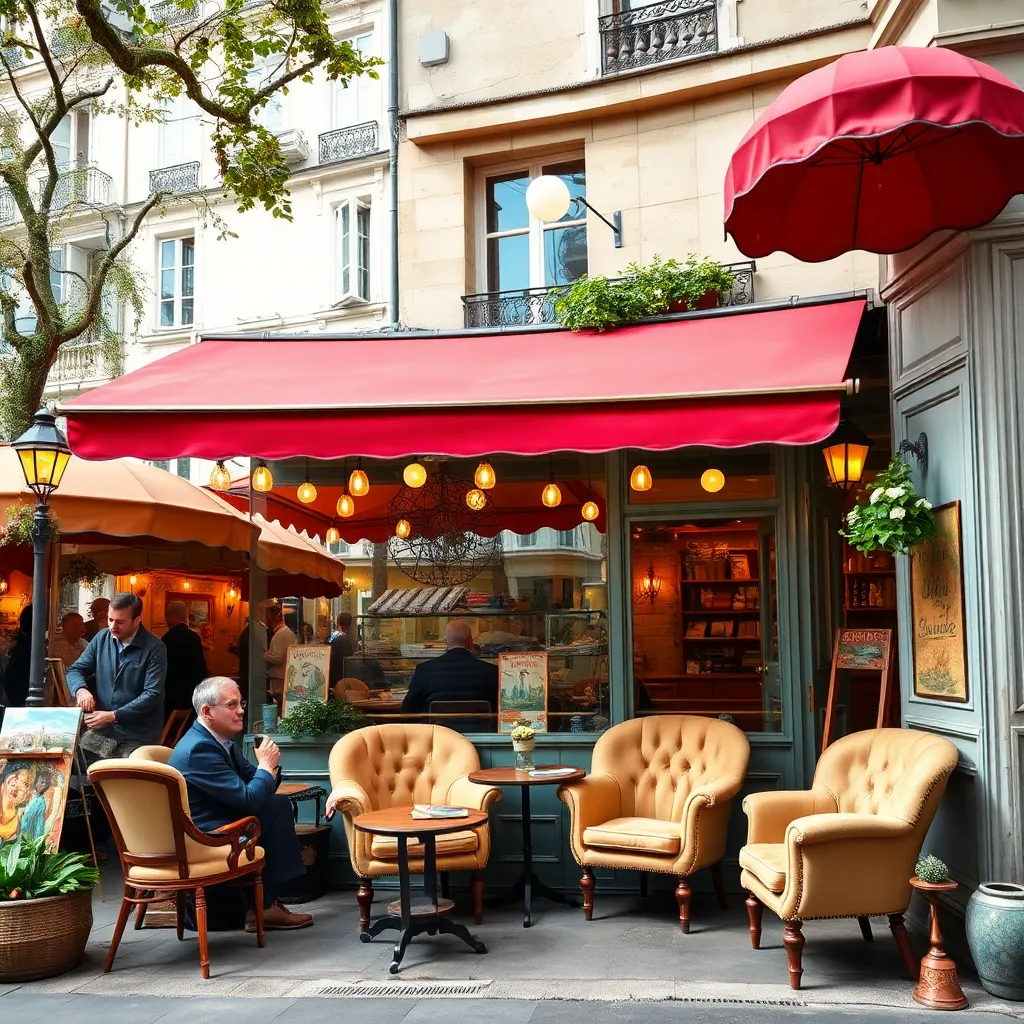 Imagine a whimsical French cafe in the heart of Montmartre, Paris. The atmosphere is lively with street performers and artists. The cafe's exterior is adorned with vibrant awnings, while the interior is warm and cozy with plush armchairs and vintage decor. Generate an image that captures the essence of this charming spot.