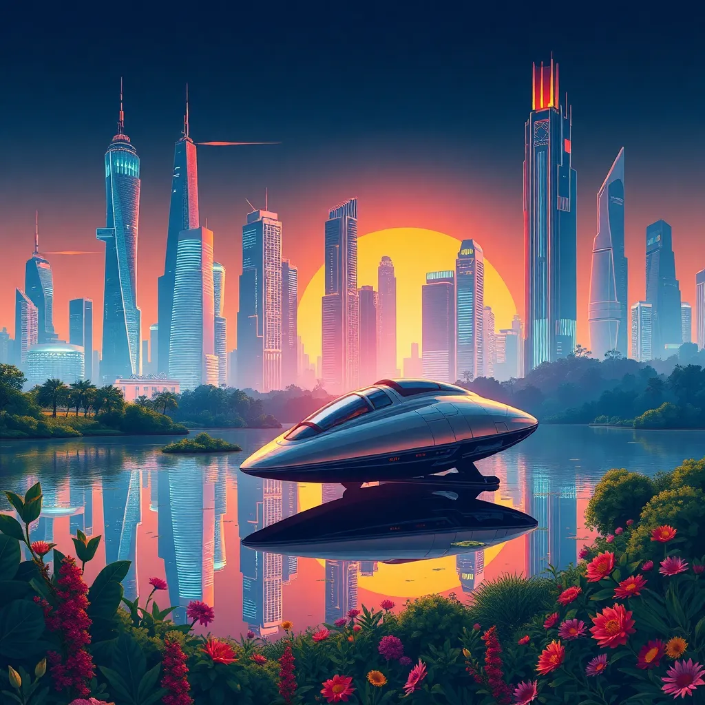 Create an illustration of a futuristic cityscape at sunset, with towering skyscrapers and neon lights reflecting off a tranquil lake. Incorporate a sleek, silver spacecraft landing on the lake's edge, surrounded by lush greenery and vibrant flowers. The atmosphere should be serene and futuristic, with a warm orange glow.