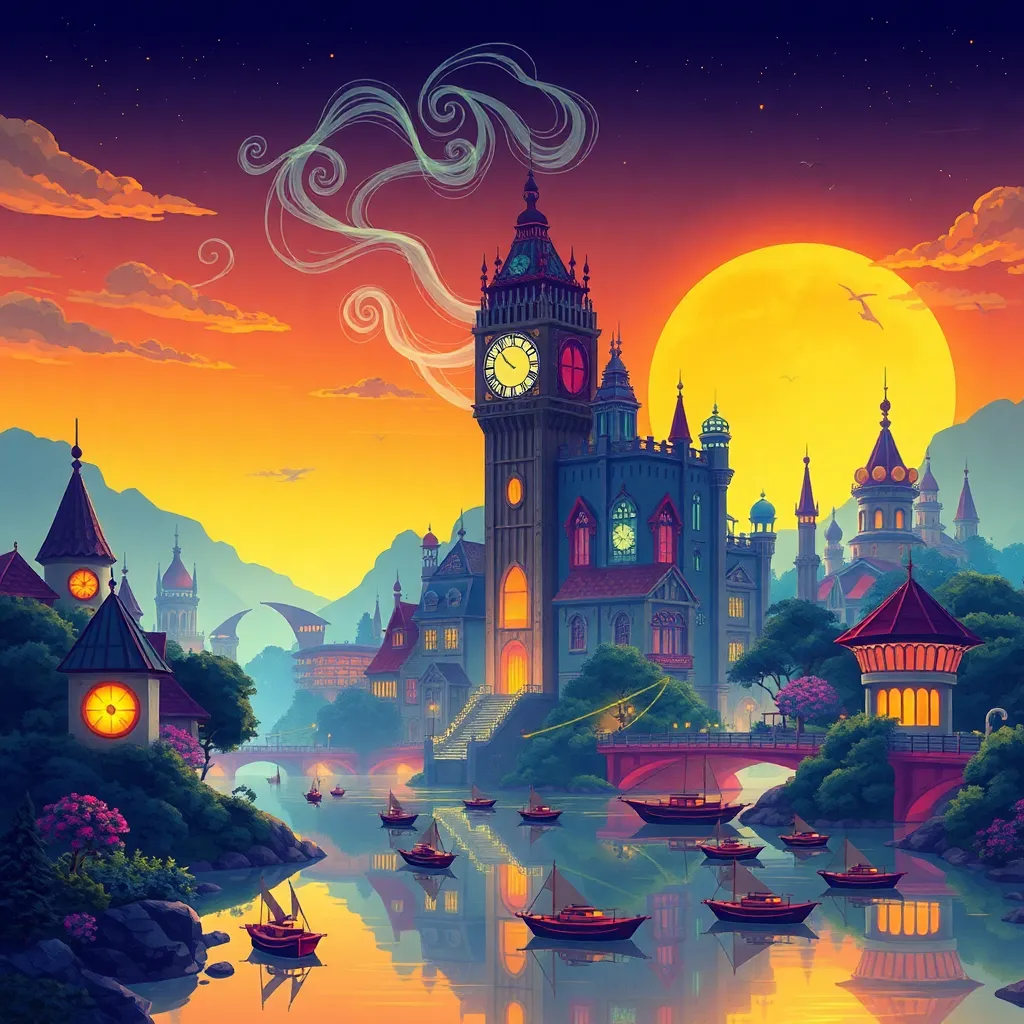 Create an illustration of a whimsical, steampunk-inspired cityscape at sunset, with intricate clockwork machinery and gears integrated into the architecture. Include a prominent clock tower with a glowing face, surrounded by wispy clouds and a hint of fog. Add a sense of nostalgia and adventure to the scene.