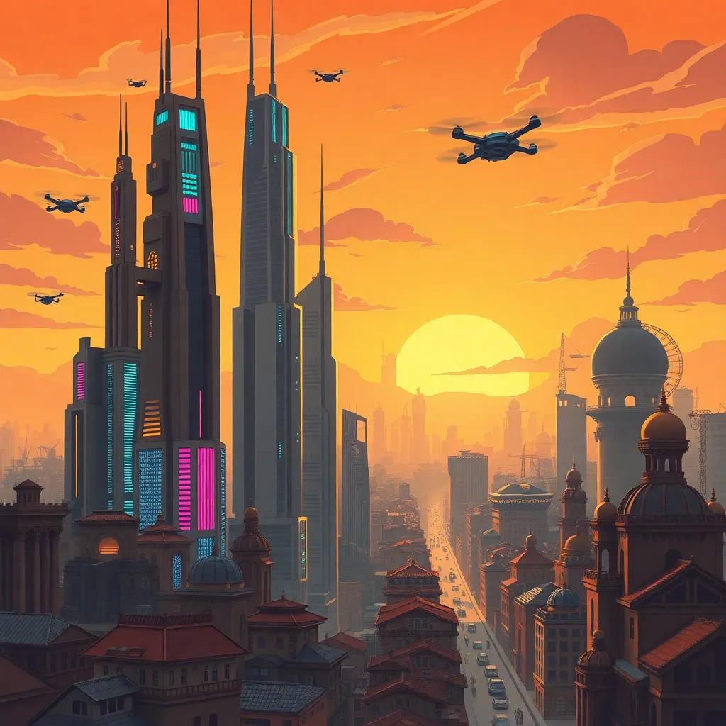 Create an illustration of a whimsical, futuristic cityscape at sunset. Incorporate towering skyscrapers with neon lights, hovering drones, and a sprawling metropolis with a mix of ancient and modern architecture. The sky should be a warm orange hue with clouds shaped like animals. Incorporate a sense of movement and energy.