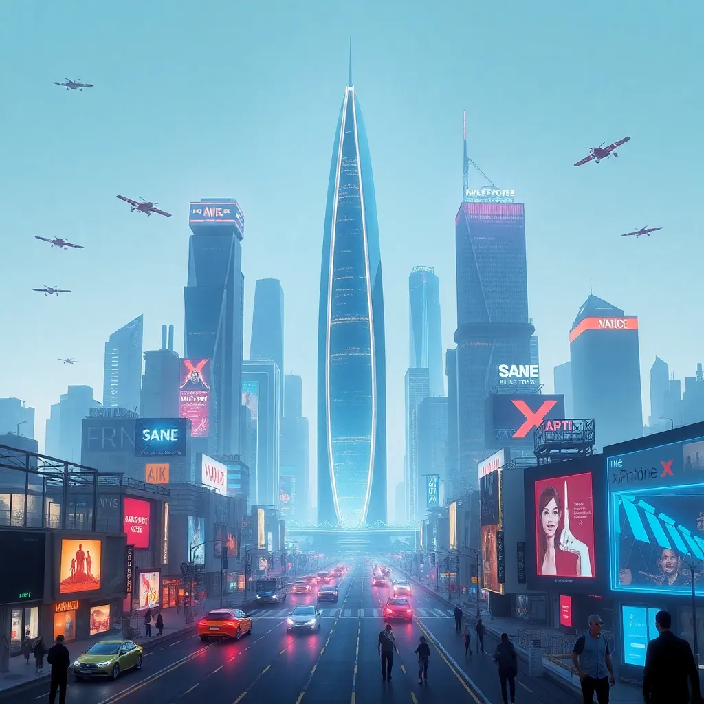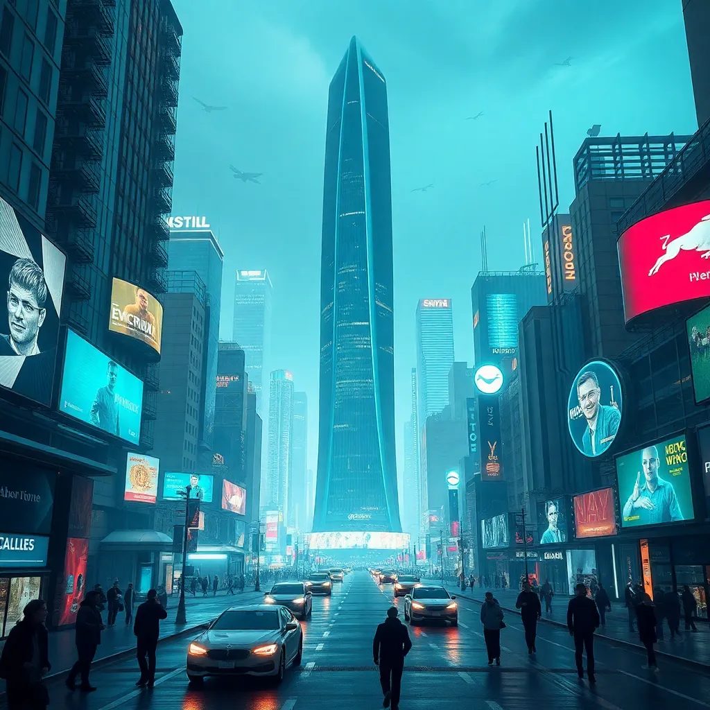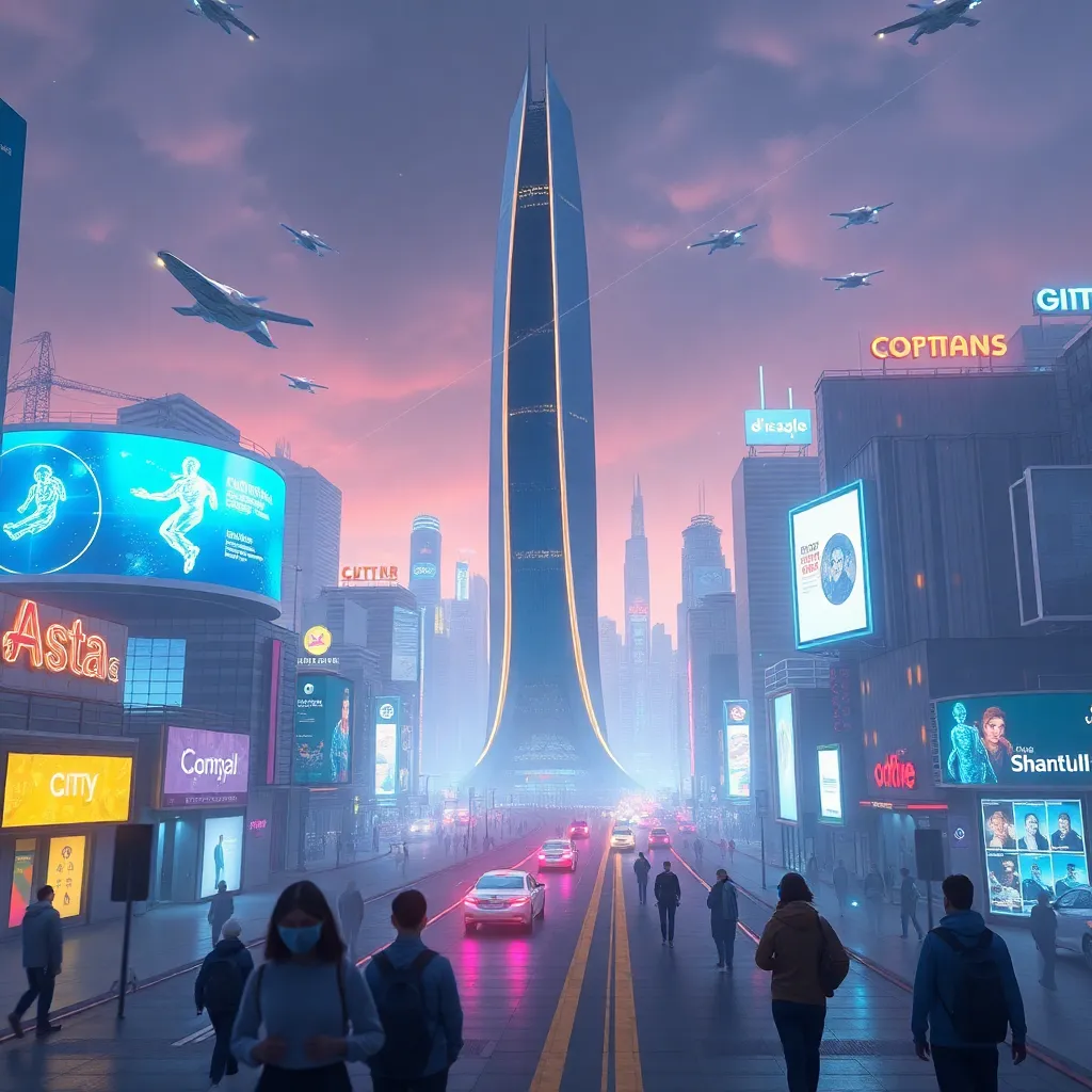 Create a futuristic cityscape with a sleek, curved skyscraper in the center, surrounded by a bustling metropolis with flying cars, holographic advertisements, and pedestrians wearing augmented reality glasses. Incorporate a subtle neon glow and a vibrant color palette to capture the essence of a futuristic urban landscape.