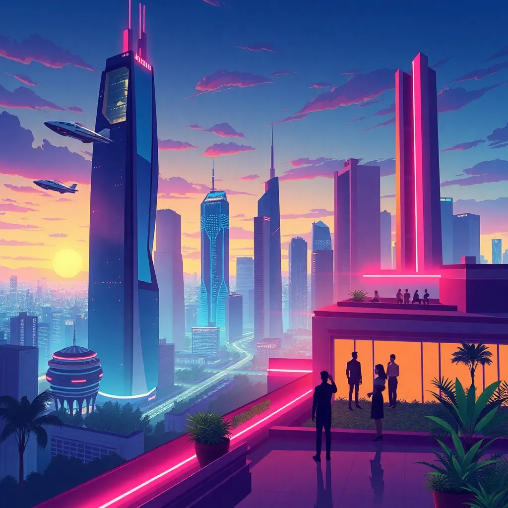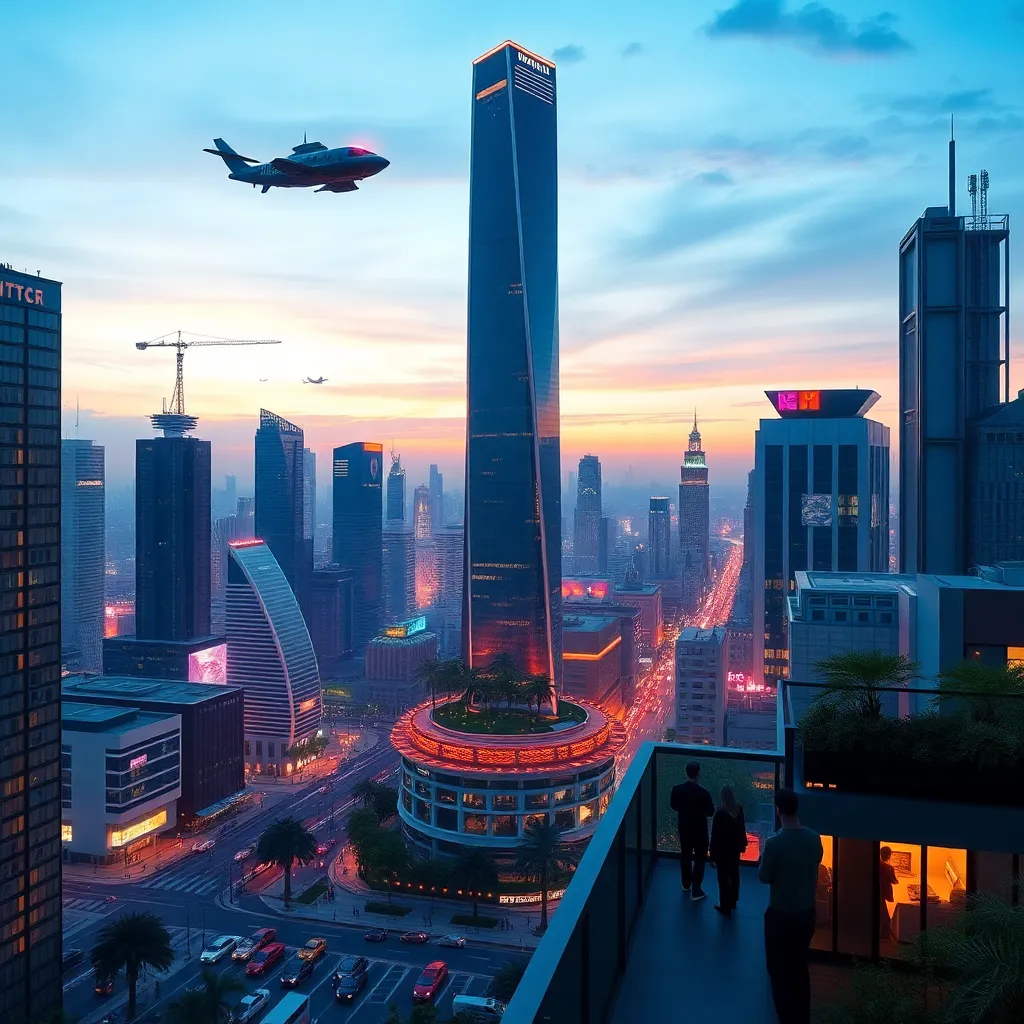 Create a futuristic cityscape at dusk with a sleek, silver skyscraper in the center, surrounded by neon-lit buildings and a bustling street scene. Incorporate a hovering flying taxi and a group of pedestrians admiring the city view from the rooftop garden. Use a vibrant color palette with a mix of cool and warm tones.