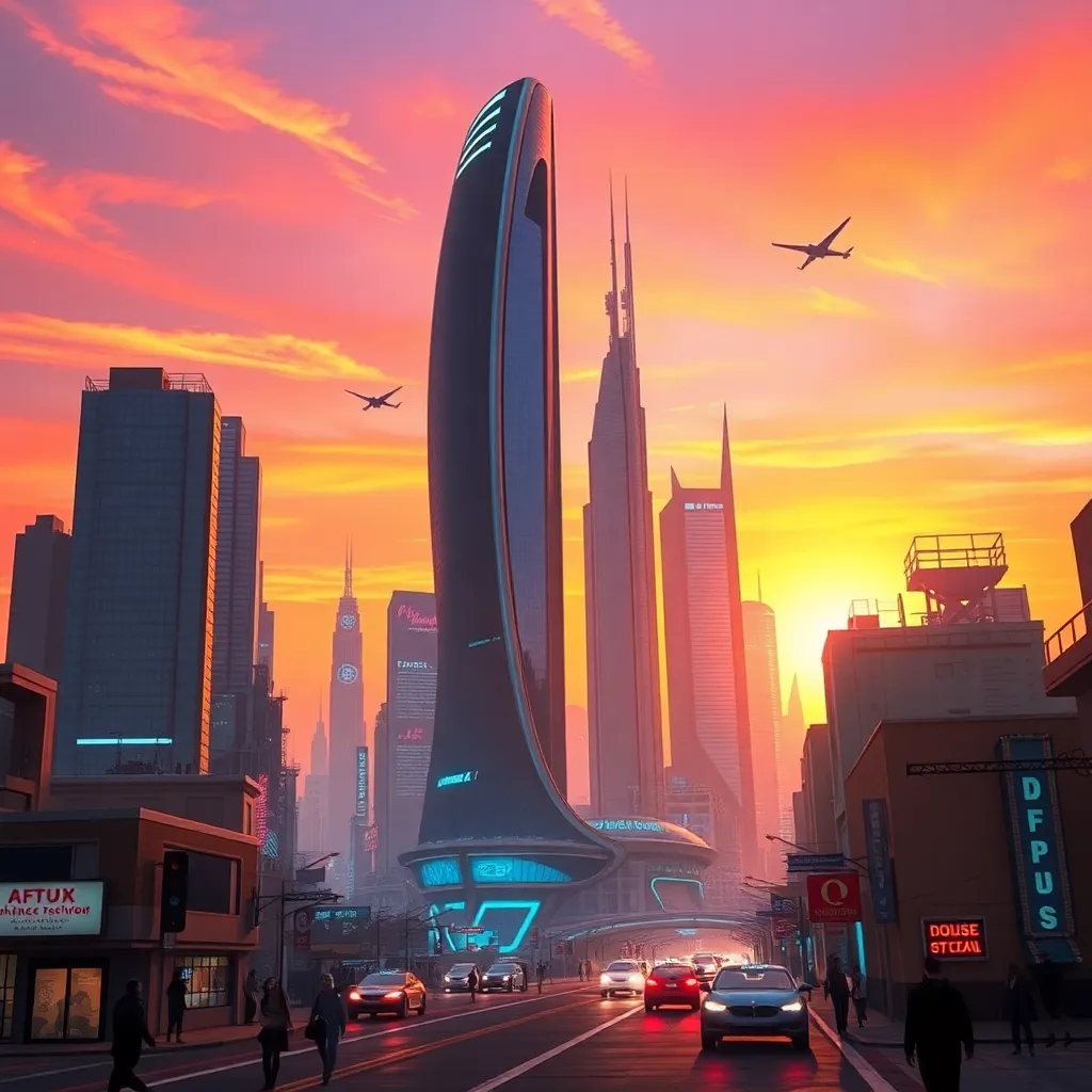 Create a futuristic cityscape at sunset, with a grand, curved skyscraper in the center, surrounded by sleek, neon-lit skyscrapers and flying cars. Incorporate a vibrant, orange-pink sky with wispy clouds, and a bustling street scene with people in futuristic attire, showcasing a blend of technology and urban life.