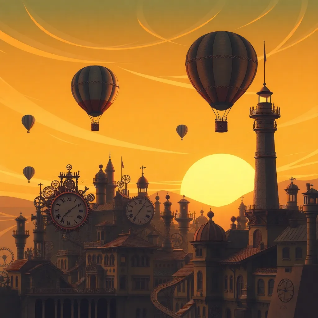 Create an illustration of a whimsical, steampunk-inspired cityscape at sunset. Incorporate intricate clockwork machinery, vintage hot air balloons, and a sprawling metropolis with Gothic architecture. The sky should be ablaze with warm oranges and yellows, with a hint of smoke and fog in the distance.
