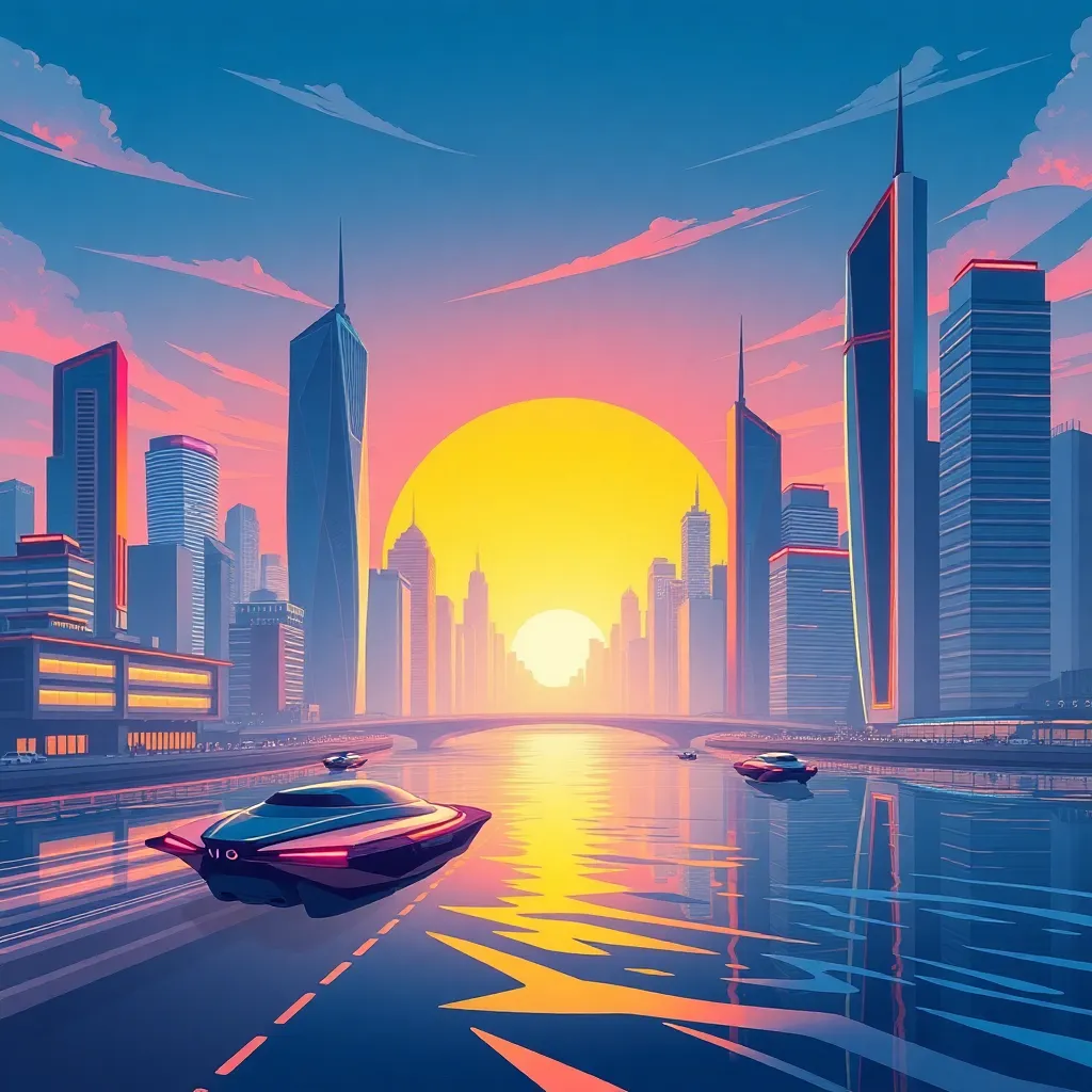 Create an illustration of a futuristic cityscape at sunset, with sleek skyscrapers and neon lights reflecting off the water. Incorporate a few hovercars and drones zipping by, and add a sense of vibrant energy and optimism to the scene. Color palette should be bold and bright, with a focus on blues and oranges.