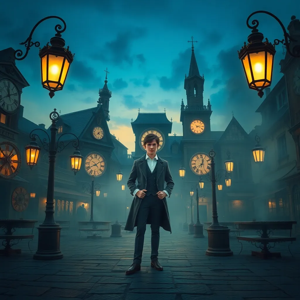 Imagine a whimsical, steampunk-inspired city square at dusk, with Claude, a charming French aristocrat, standing proudly in the center, surrounded by intricate clockwork mechanisms, vintage lanterns, and a faint mist of smoke. The atmosphere is mystical, with a hint of magic and adventure. Create an image that captures this scene.
