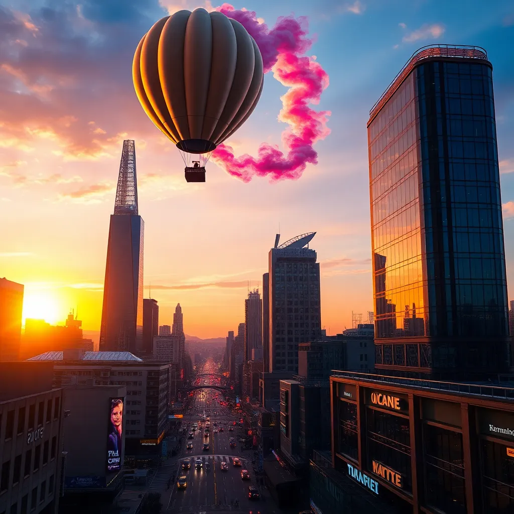 Create a futuristic cityscape at sunset, with sleek skyscrapers and neon lights reflecting off a bustling street. Incorporate a vintage-style hot air balloon floating above the buildings, releasing a trail of colorful smoke. The atmosphere should be vibrant and energetic, with a sense of excitement and adventure.