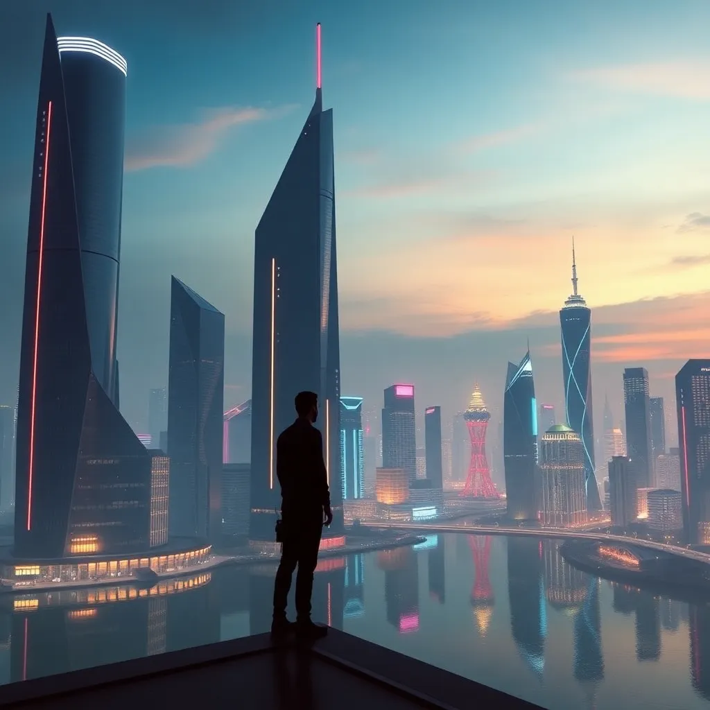 Create a futuristic cityscape at dusk, with sleek skyscrapers and neon lights reflecting off a calm lake. Incorporate a lone figure, Claude, standing on the rooftop of the tallest building, gazing out at the city he has helped shape. The atmosphere should be vibrant, yet melancholic, with a hint of nostalgia.
