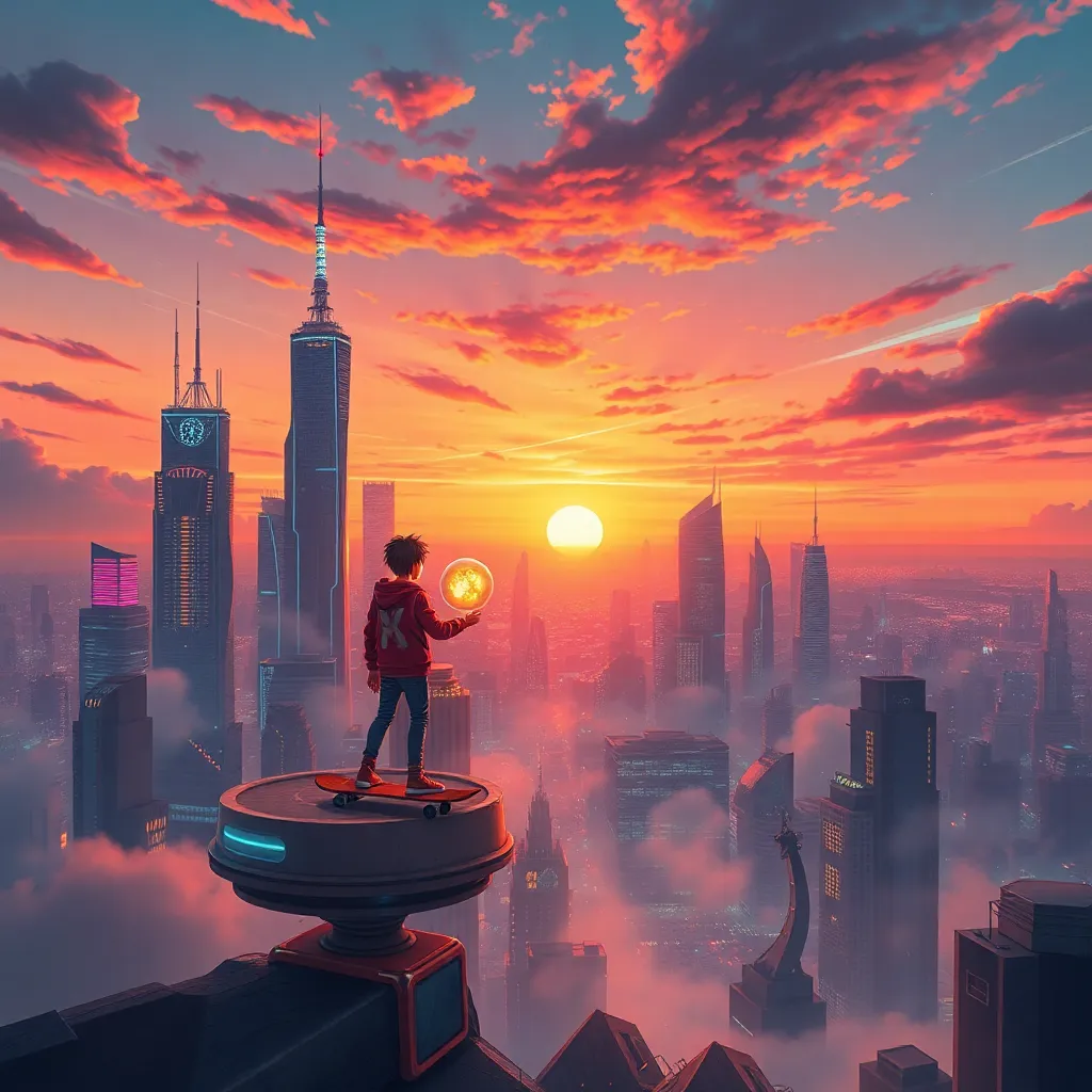 Imagine a whimsical, futuristic cityscape at sunset, with towering neon-lit skyscrapers, wispy clouds, and a lone figure, Claude, standing atop a hovering skateboard, holding a glowing orb and gazing out at the breathtaking view. Incorporate vibrant colors, intricate details, and a sense of wonder and magic.