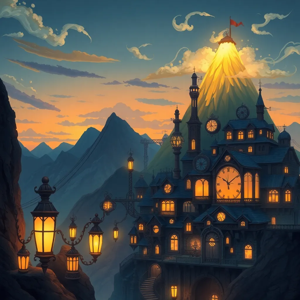 Create an illustration of a whimsical, steampunk-inspired cityscape at dusk. Incorporate intricate clockwork mechanisms, glowing lanterns, and wispy clouds. The city should be built into the side of a mystical, glowing mountain. Incorporate subtle hints of ancient magic and mysterious energy emanating from the structures.