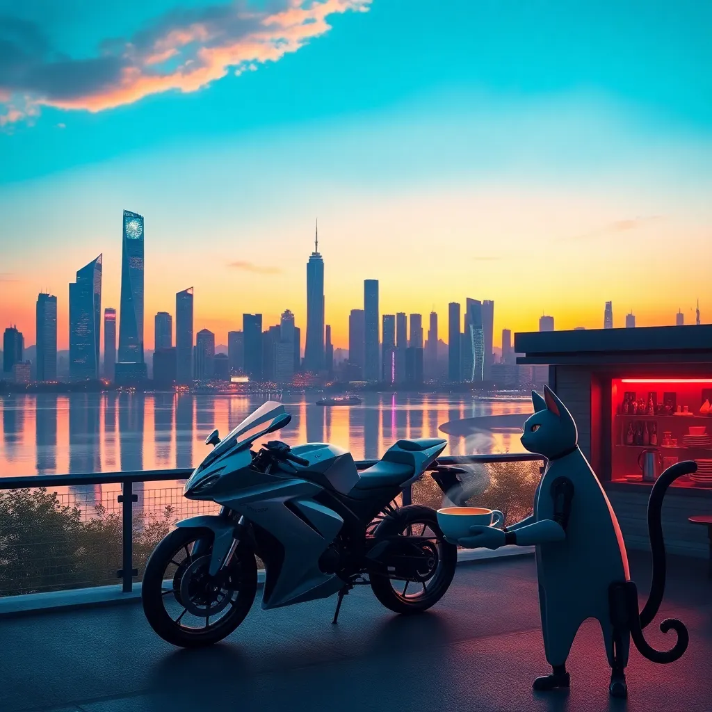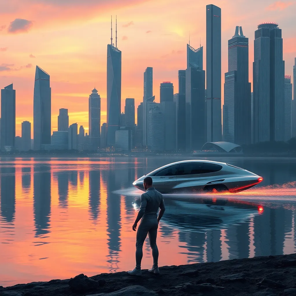 Imagine a futuristic cityscape at sunset, with sleek skyscrapers and neon lights reflecting off a calm lake. A sleek, silver hovercar speeds by, leaving a trail of sparks. In the foreground, a lone figure in a futuristic suit stands at the water's edge, looking out at the cityscape with a sense of wonder.