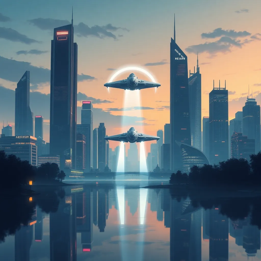 Create an illustration of a futuristic cityscape at dusk, with towering skyscrapers and neon lights reflecting off a serene lake. Incorporate a sleek, silver spacecraft landing in the distance, surrounded by a halo of light. The atmosphere should be calm and peaceful, with a hint of technological advancement.