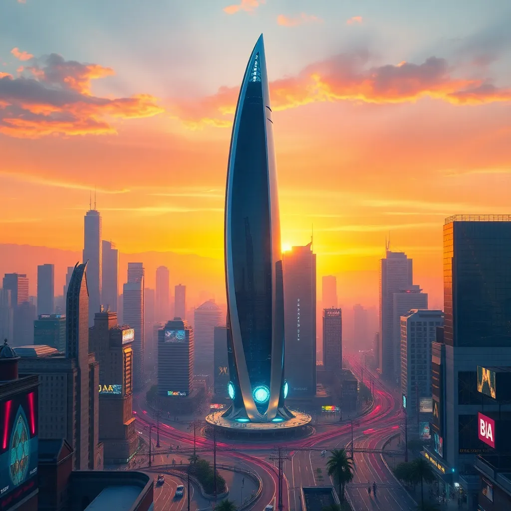 Create a futuristic cityscape at sunset with a sleek, silver skyscraper in the center. The building should have a curved, aerodynamic design with glowing blue accents. The surrounding city should be bustling with flying cars and pedestrians. Incorporate vibrant colors and a sense of movement to capture the dynamic atmosphere.