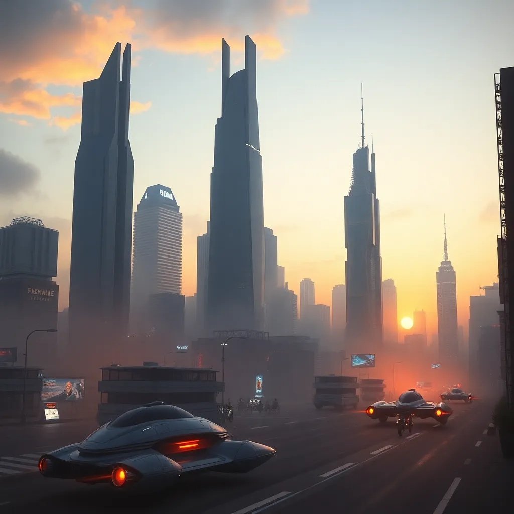 Generate an image of a futuristic cityscape at sunset, with towering skyscrapers and sleek architecture. The city should be surrounded by a misty atmosphere, with a hint of neon lights and a sense of nostalgia. Incorporate a futuristic transportation system, such as flying cars or hoverbikes, in the foreground.