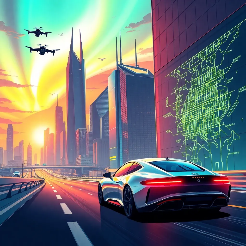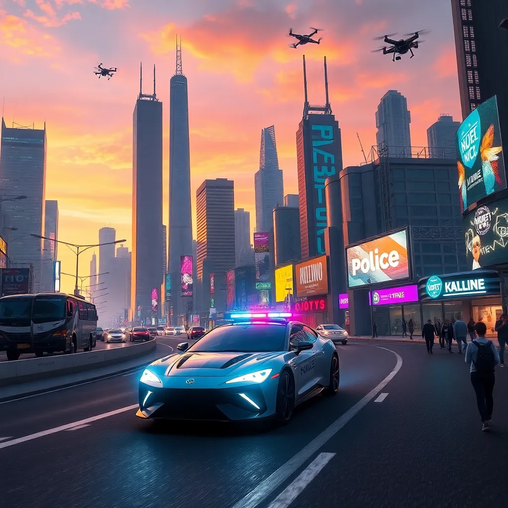 Create a futuristic cityscape at sunset, with towering skyscrapers and neon-lit streets. Incorporate a sleek, high-tech police car speeding down the main road, surrounded by holographic advertisements and bustling pedestrians. Add a touch of sci-fi flair with hovering drones and a vibrant, colorful atmosphere.