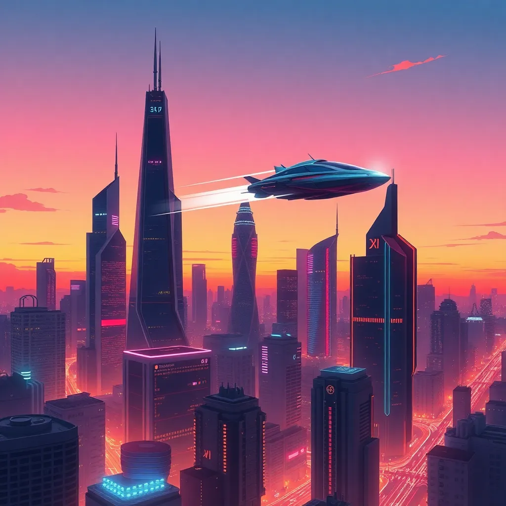 Imagine a futuristic cityscape at dusk, with sleek skyscrapers and neon lights reflecting off the wet pavement. A flying car soars above, leaving a trail of sparks behind. The atmosphere is vibrant and electric, with a sense of excitement and possibility. Generate an image that captures this dynamic scene.