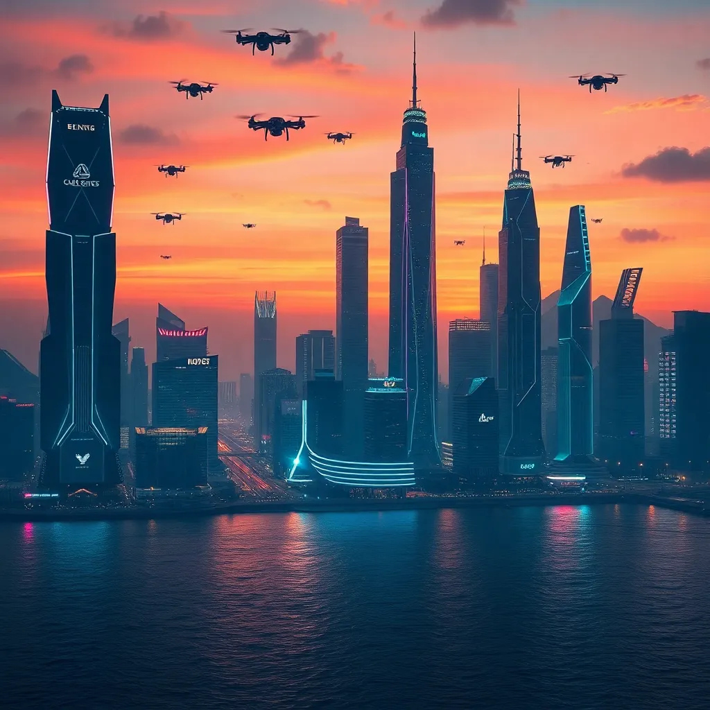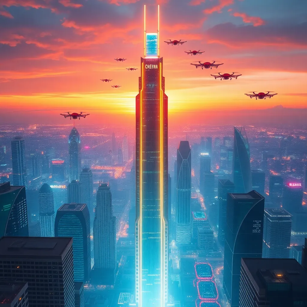 Create a futuristic cityscape at sunset with a glowing neon-lit skyscraper in the foreground, surrounded by a sprawling metropolis with sleek, curved buildings and hovering drones. Incorporate vibrant colors and subtle atmospheric effects to capture the essence of a bustling, high-tech urban environment.